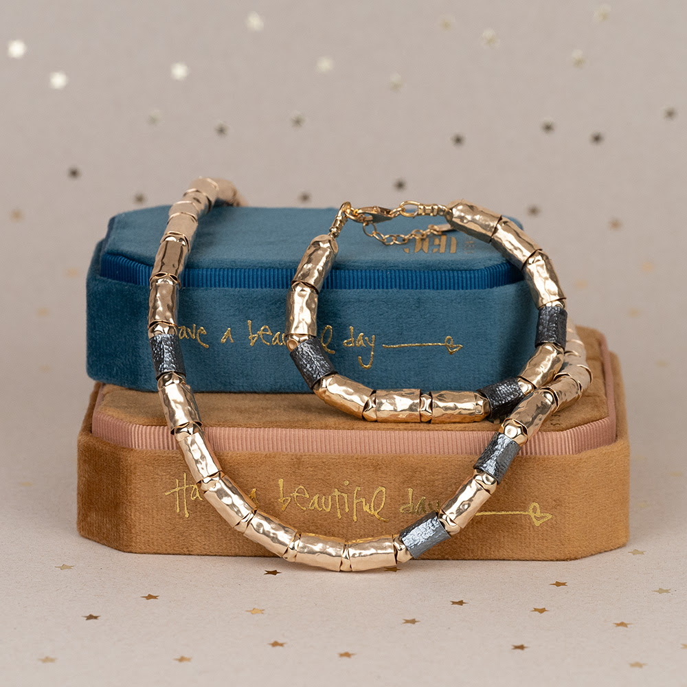 Deze armband van Jeh Jewels is gemaakt van 925 sterling zilver, geoxideerd zilver en goldfilled. De afwisseling van buisjes en hamerslagdetails geeft het sieraad een speels en karaktervol uiterlijk, terwijl de soepele vorm zorgt voor een prettig draagcomfort.