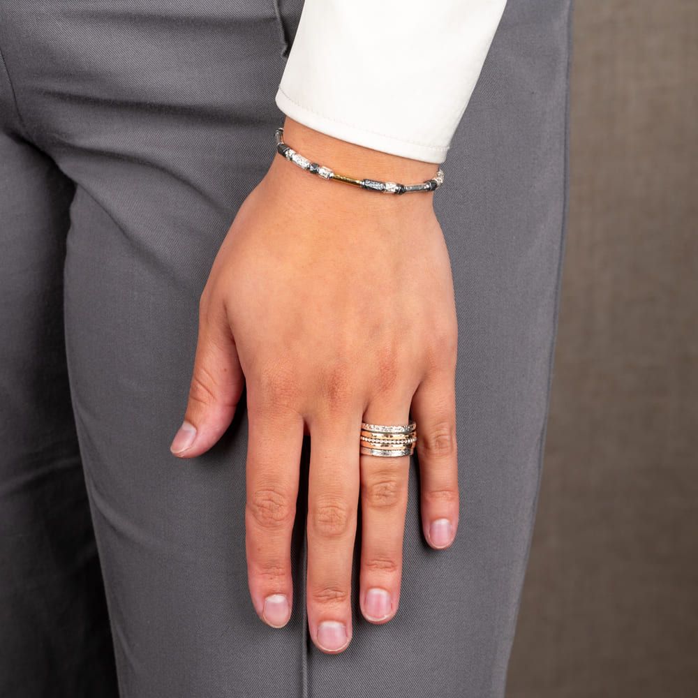 Stoere gave ring gemaakt van 925 sterling zilver, met daarbij ringentjes van rosé goldfilled en geel goldfilled.