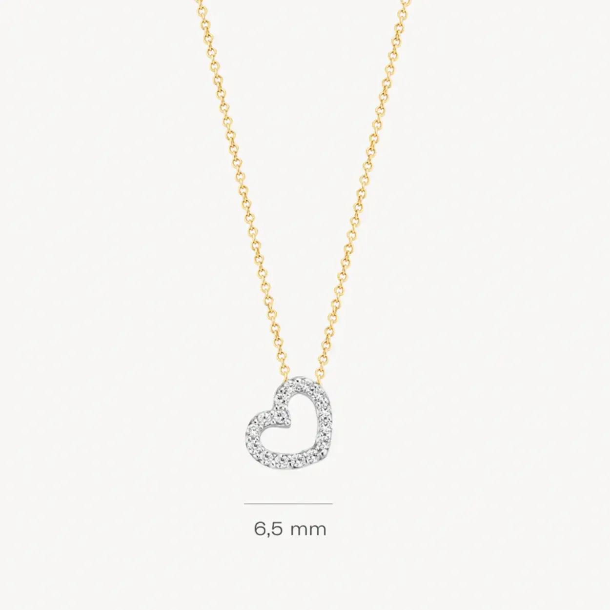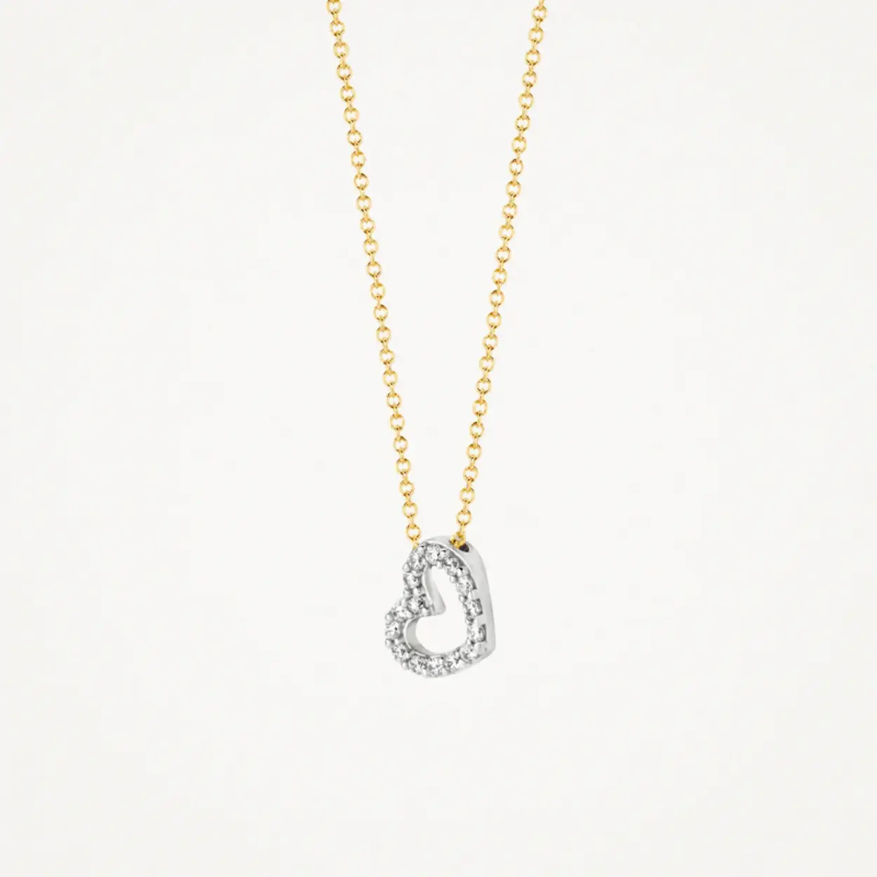 Geelgoud, witgoud en een hart van Zirkonia…Perfecte ingrediënten voor dit stijlvolle gouden collier. De geelgouden open schakels verdwijnen in het witgouden hart waarin 15 Zirkonia’s zijn verwerkt. Dit bicolor collier is geschikt voor elke gelegenheid. De ketting is 42 cm lang en sluit met een geelgouden karabijnslotje.