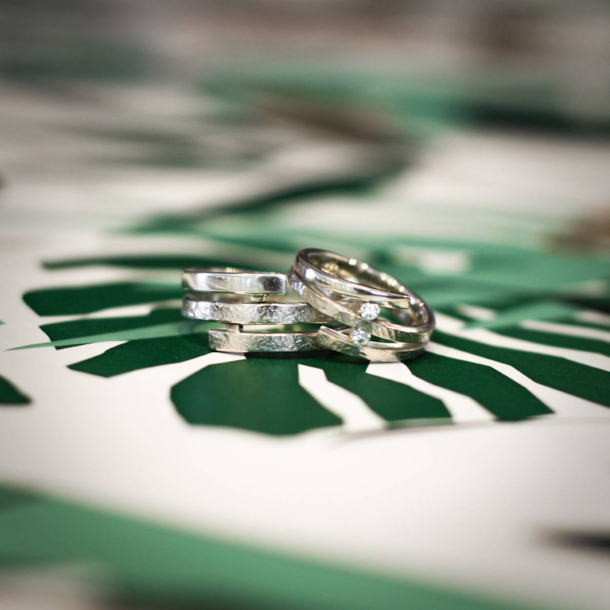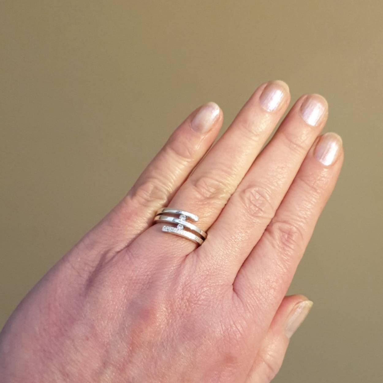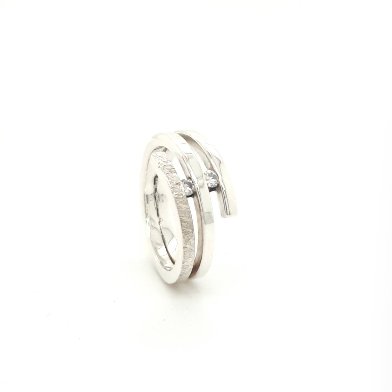 Deze sierlijke en toch stoere ring van zilver met 2 moissanietstenen zal je prachtig staan. De ring verloopt van zilver met structuur naar glanzend zilver. Door deze overgang is het een avontuurlijke ring om te dragen.