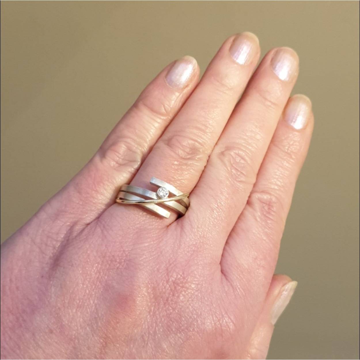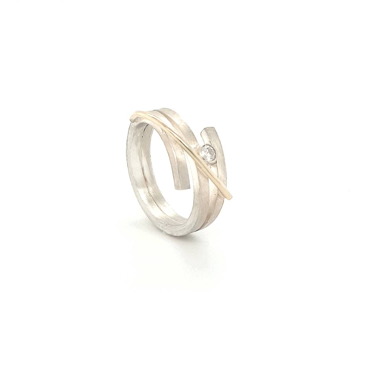 Deze sprekende ring van mat zilver met moissaniet en goud zal je prachtig staan. Het glanzende goud komt nog meer tot zijn recht door het contrast met het matte zilver en de ring is daardoor goed te dragen bij zowel gouden als zilveren sieraden. Samen met de hanger, armband en oorbellen uit deze collectie maak je een mooie set waarmee je zult stralen.