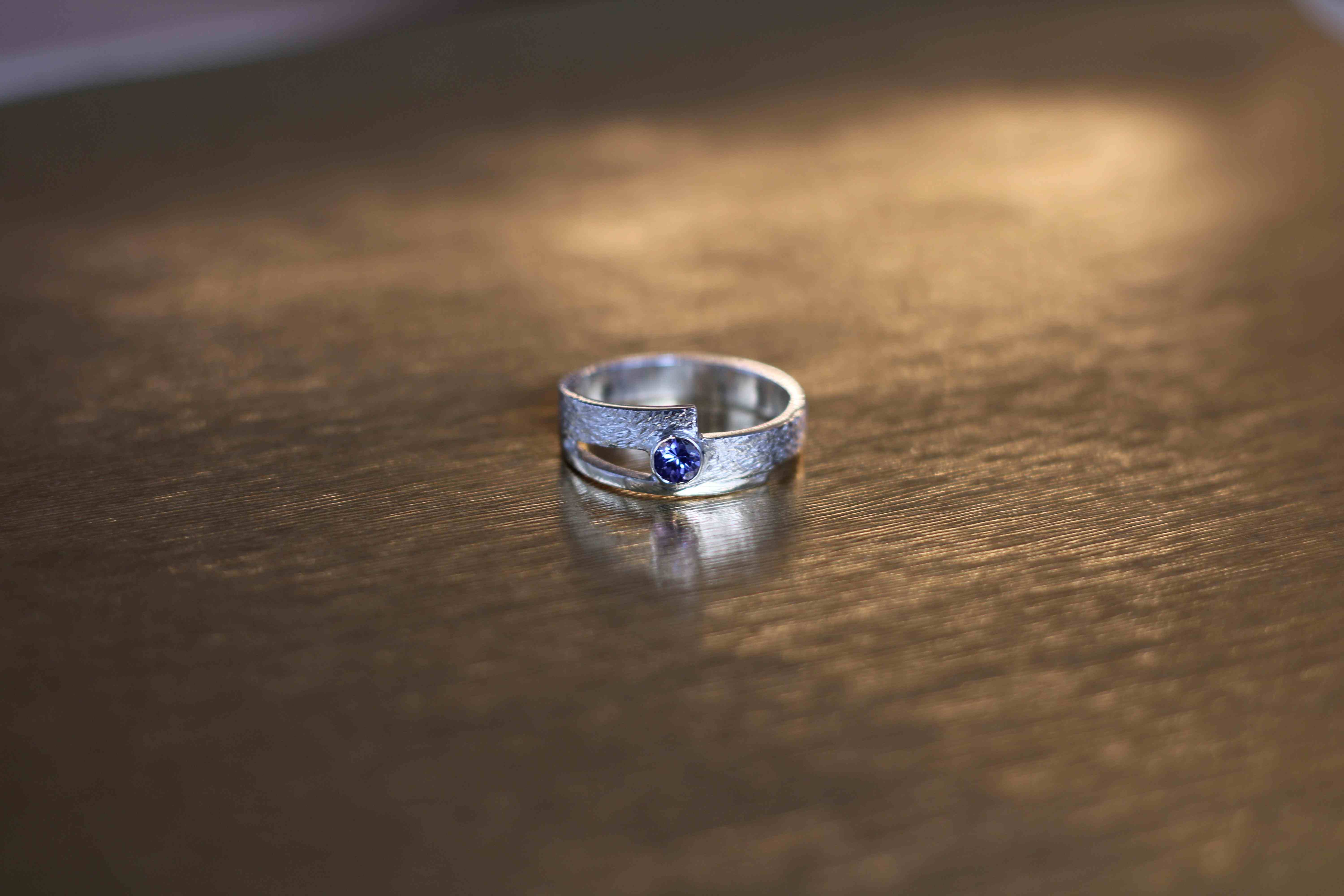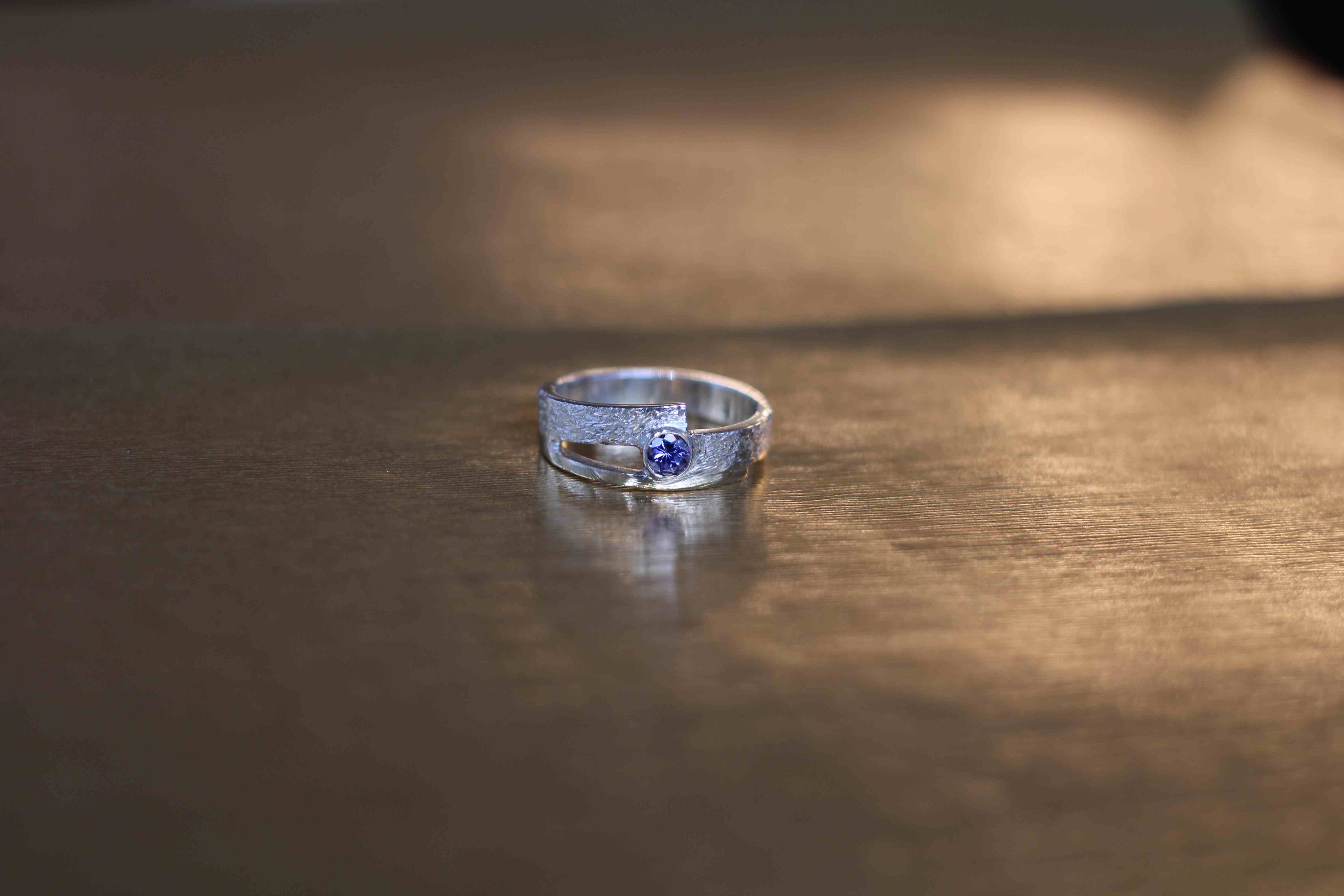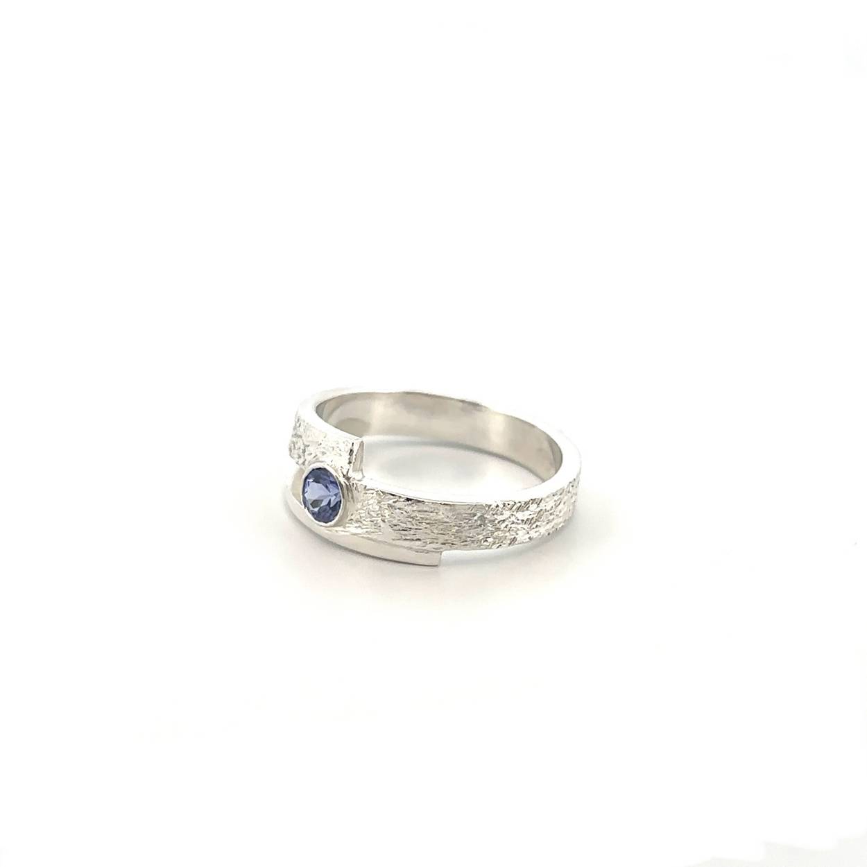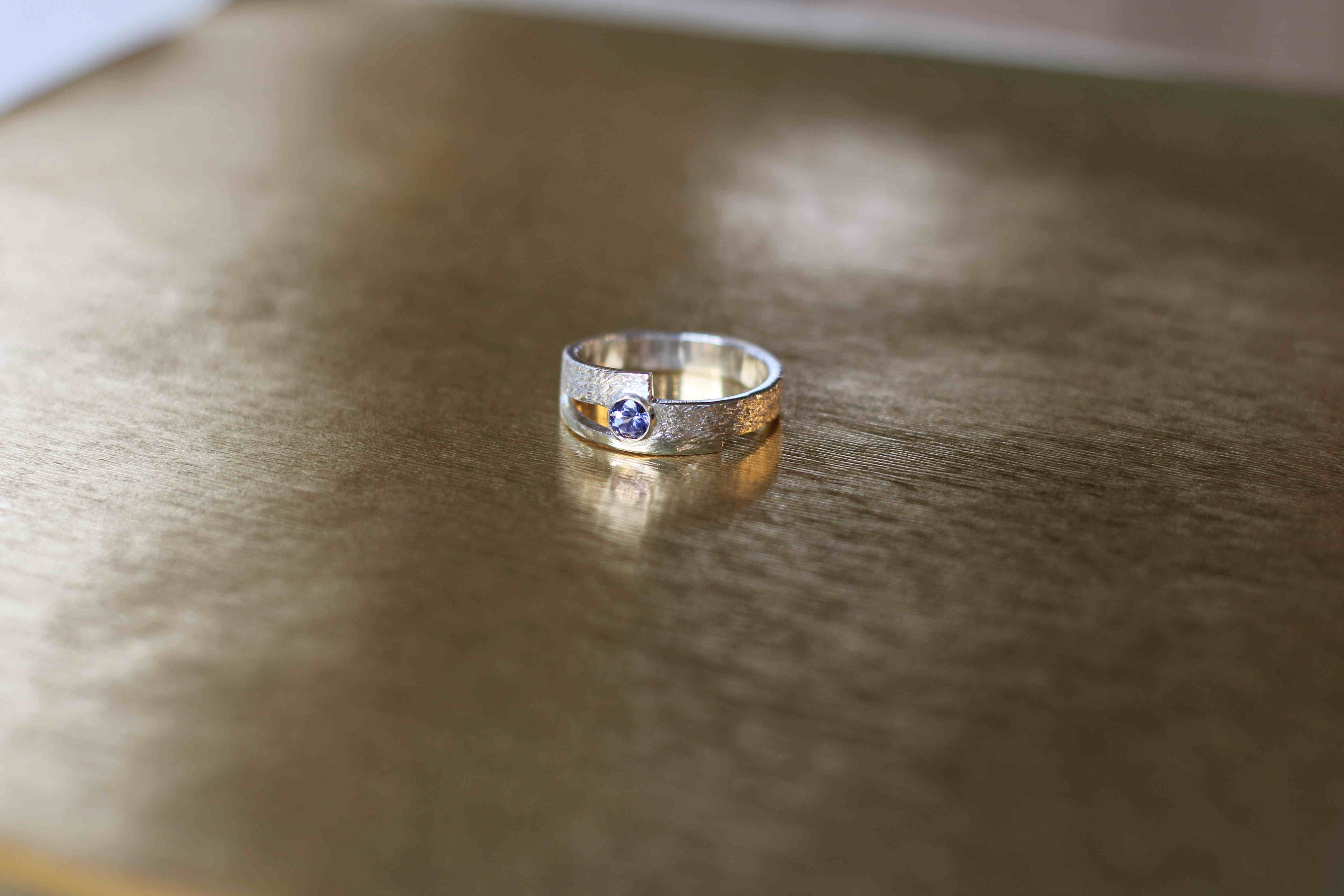 Het contrast tussen de ruwe structuur van het zilver en het glanzende deel  maakt deze ring zo bijzonder.