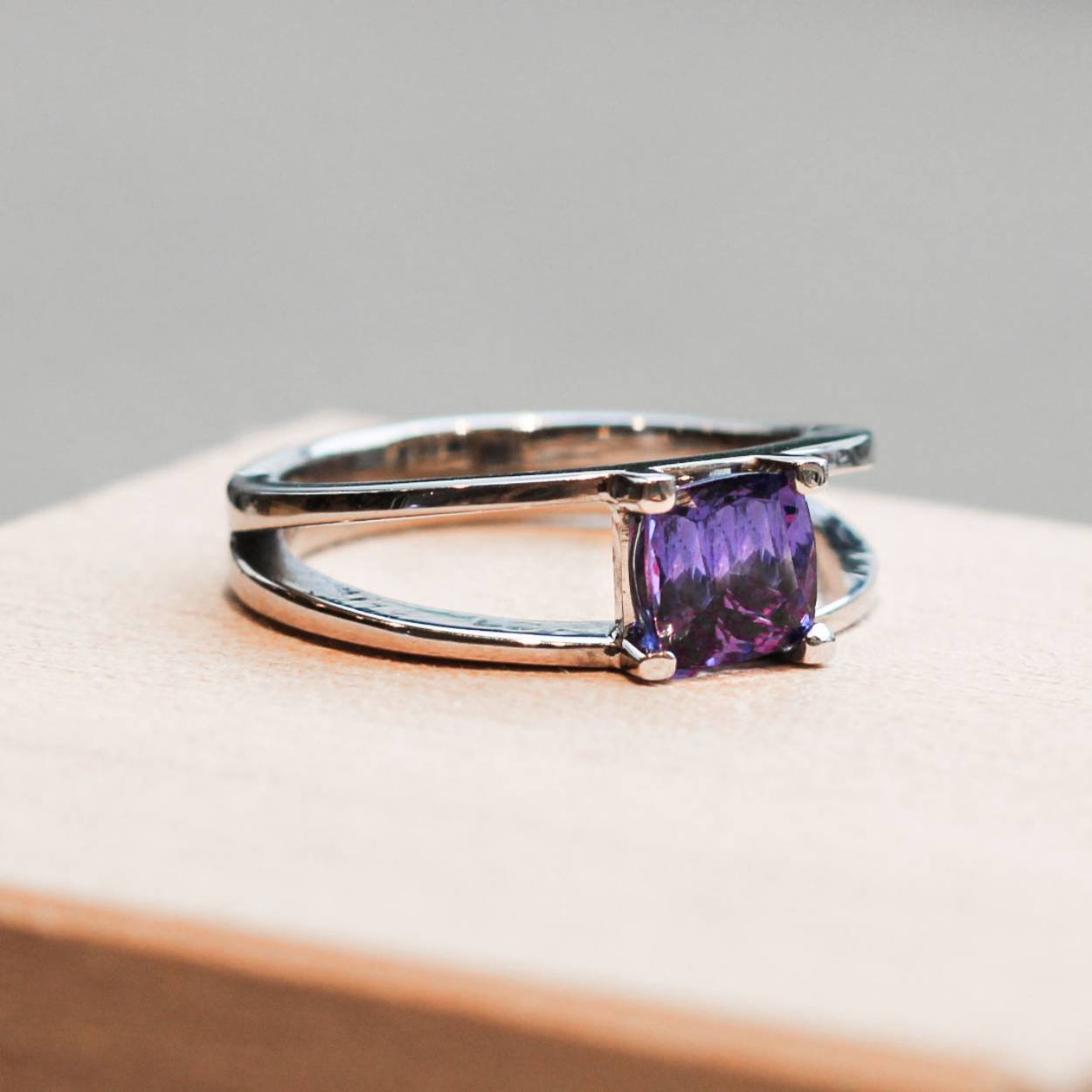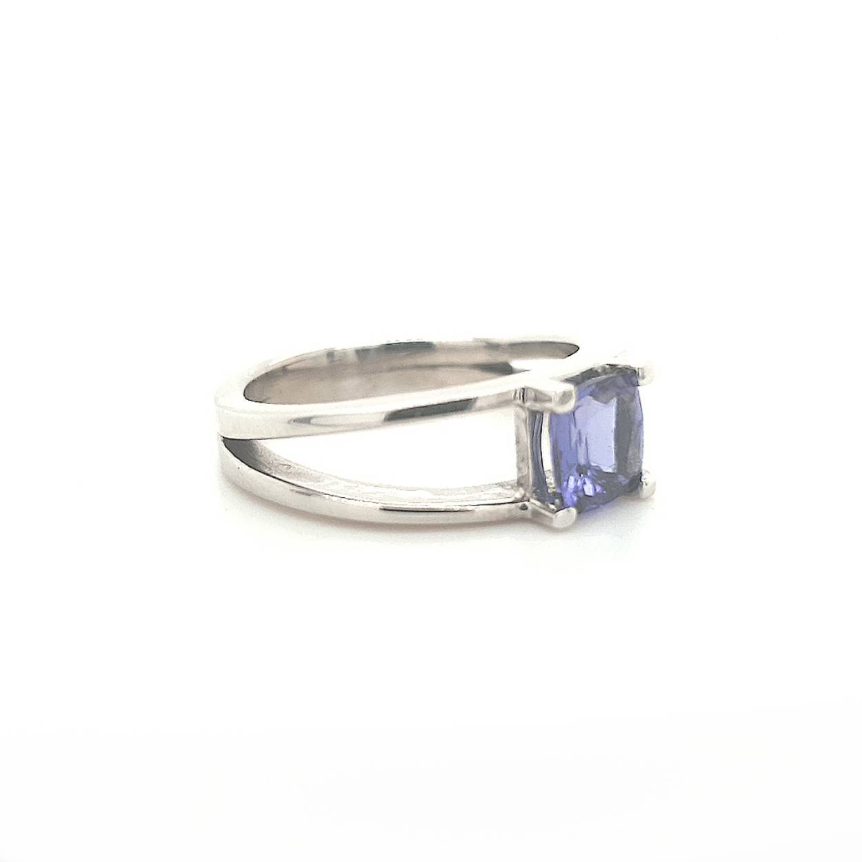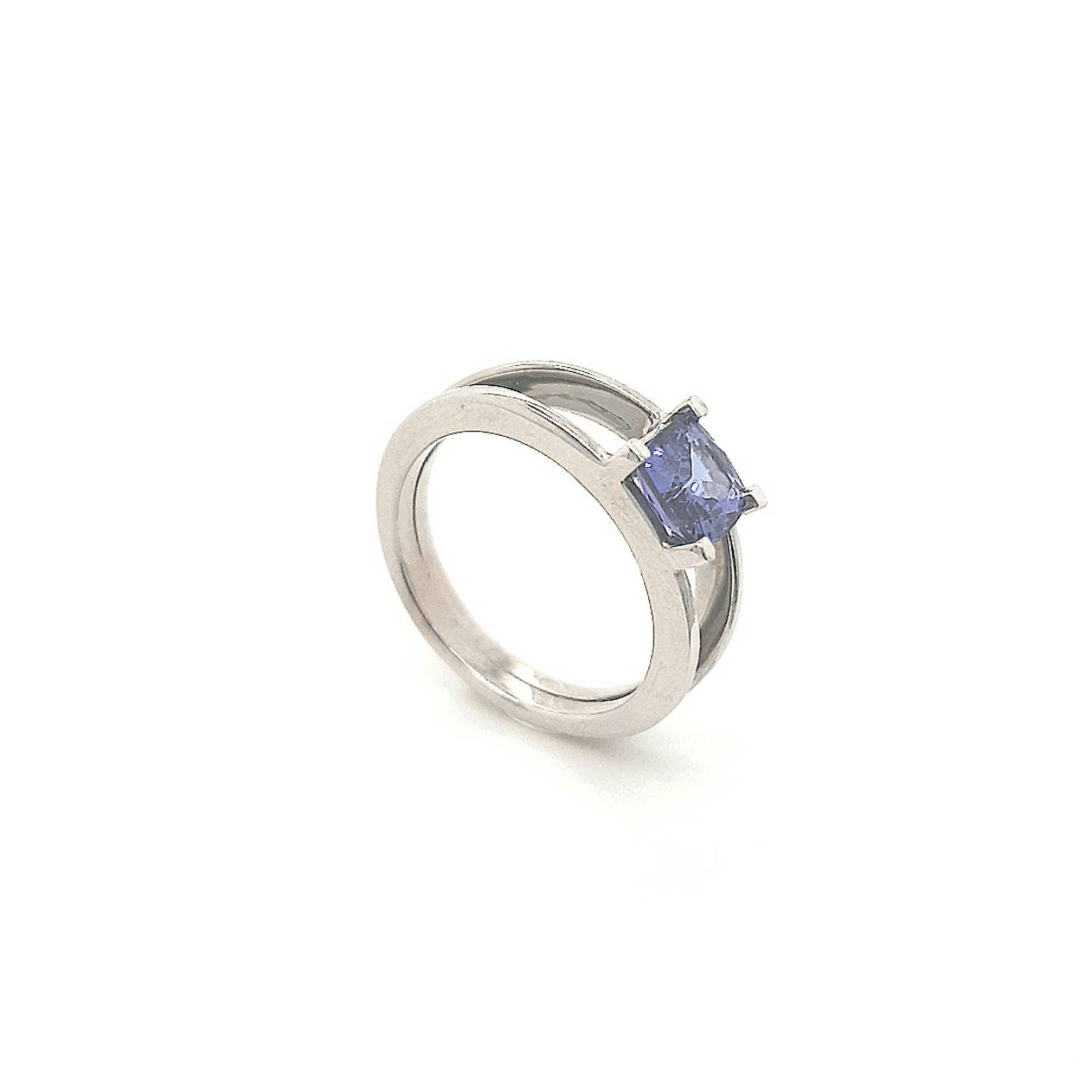 Een tanzaniet gezet in een unieke palladium witgouden ring van 14 karaat. De steen heeft een helder blauwe kleur.  Tanzaniet is een zeldzame edelsteen uit Tanzania. Tanzanieten worden in de regio van de Merelani-heuvels gevonden. Het is nog steeds de enige plek ter wereld waar deze edelstenen worden gevonden.
