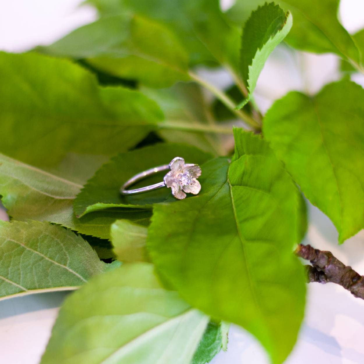 Een van onze bestsellers. Deze bloesem ring. Achter ons atelier hebben we een kleine binnenplaats met heel bijzondere appelbomen. Ieder jaar genieten we volop van de bloesem en eigenlijk willen we die niet missen als deze periode voorbij is. Dus ja waarom maken we deze niet in zilver en goud?