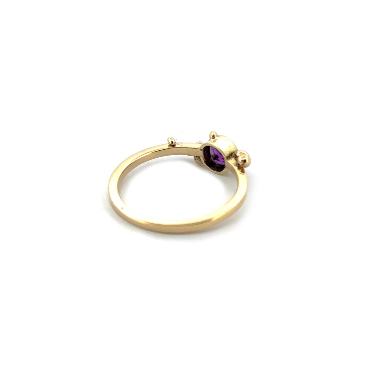 Gouden ring met amethist. Het minimalistische design zorgt ervoor dat je deze ring bij elke look kan dragen. Deze prachtige amethist heeft een diep paarse  kleur. Door de geelgouden zetting met de kleine bolletjes wordt dit sieraad een eyecatcher van jouw look.