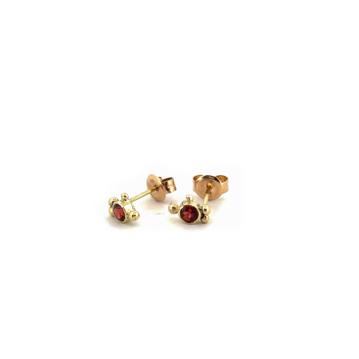 Het minimalistische design zorgt ervoor dat je deze oorstekers bij elke look kunt dragen. De prachtige granaat heeft een dieprode kleur. Door de geelgouden zetting met de kleine bolletjes wordt dit sieraad een eyecatcher van jouw look. Deze oorstekers horen bij een set met hanger en een ring.