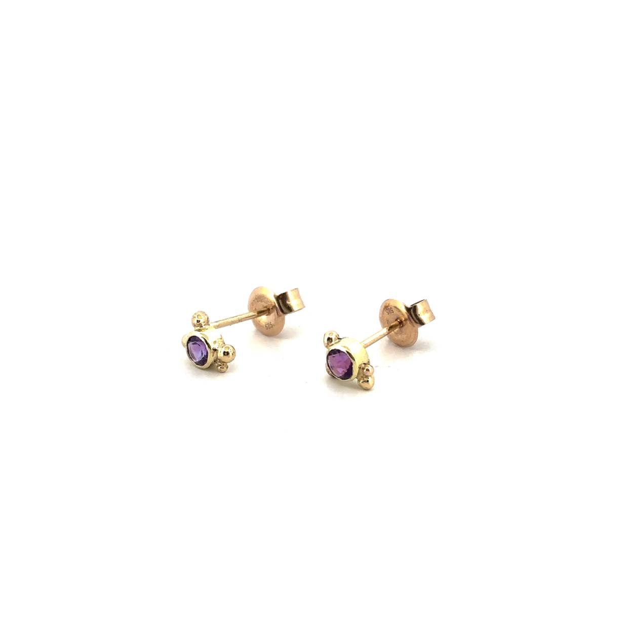 Het minimalistische design zorgt ervoor dat je deze oorstekers bij elke look kunt dragen. De prachtige amethist heeft een zacht paarse kleur. Door de geelgouden zetting met de kleine bolletjes wordt dit sieraad een eyecatcher van jouw look. Deze oorstekers horen bij een set met hanger en een ring.