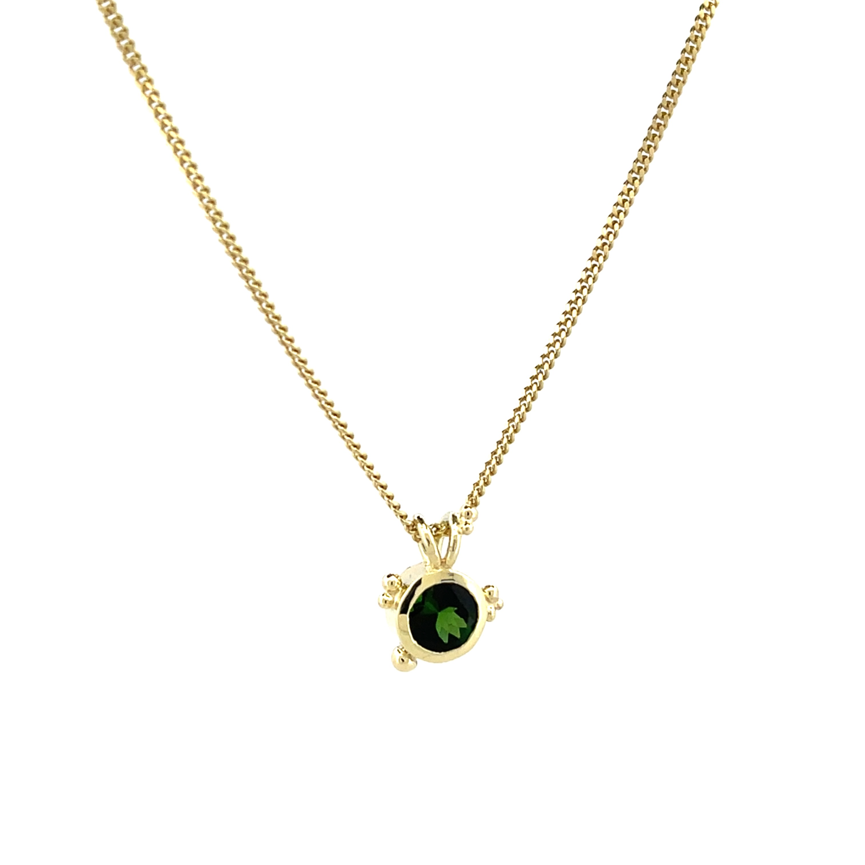 Nieuw in het atelier hebben wij onze gouden hanger met een toermalijn. Het minimalistische design zorgt ervoor dat je deze ketting bij elke look kan dragen. Deze prachtige toermalijn heeft een groene kleur. Door de geelgouden zetting met de kleine bolletjes wordt dit sieraad een eyecatcher van jouw look. Deze hanger hoort bij een set met oorstekers en een ring. In al onze sieraden kunnen wij verschillende edelstenen zetten. De verschillende kleuren van de edelstenen kunnen namelijk een hanger compleet veranderen. Alles is mogelijk! Laat ons weten wat jouw favoriete kleur is en wij kijken wat de mogelijkheden zijn.