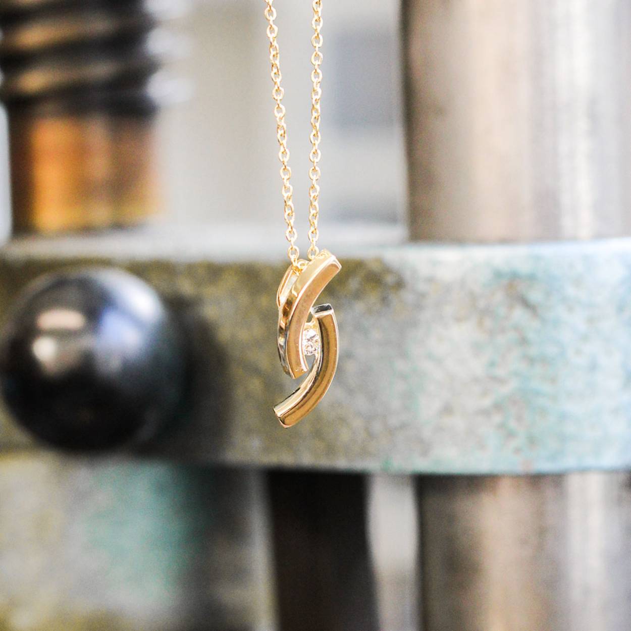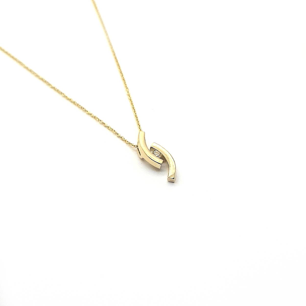 Deze gouden hanger bestaat uit 2 verschillende delen die elkaar omarmen met in het midden een diamant. Bij deze hanger hoort een bijpassende ring en oorknoppen die samen perfect te dragen zijn. Dit simplistische design zorgt ervoor dat je deze prachtige set bij elke look kan dragen waardoor het gelijk je favoriete sieraad zal worden.
