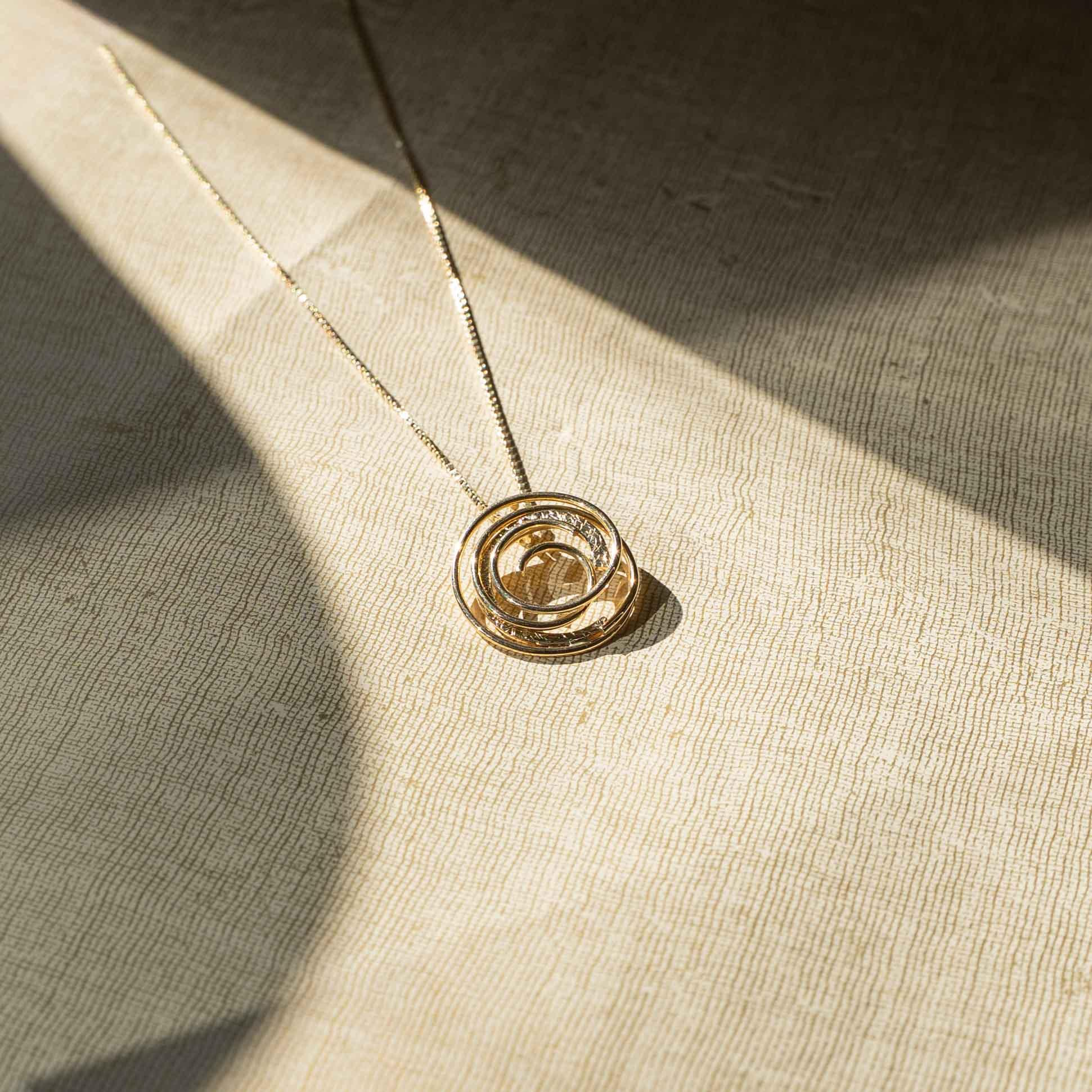 De hanger Connect bestaat uit 2 geelgouden draden die worden verbonden door een brede ruw bewerkte baan. Het symboliseert de levensloop van twee mensen die samen komen en een verbintenis aangaan.