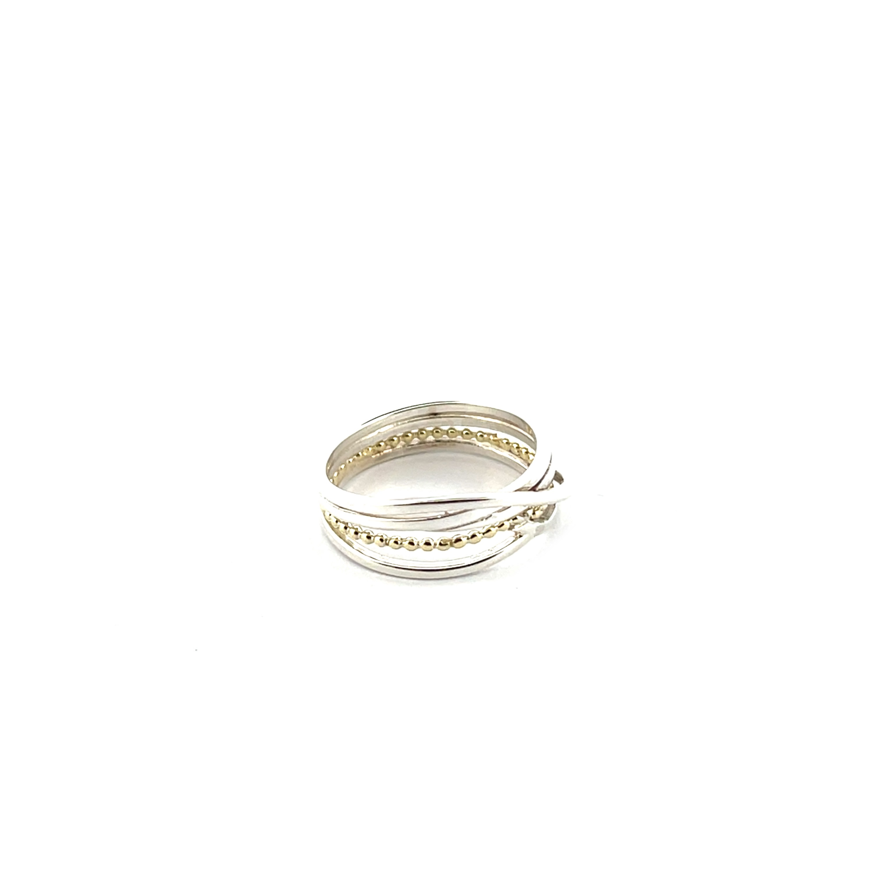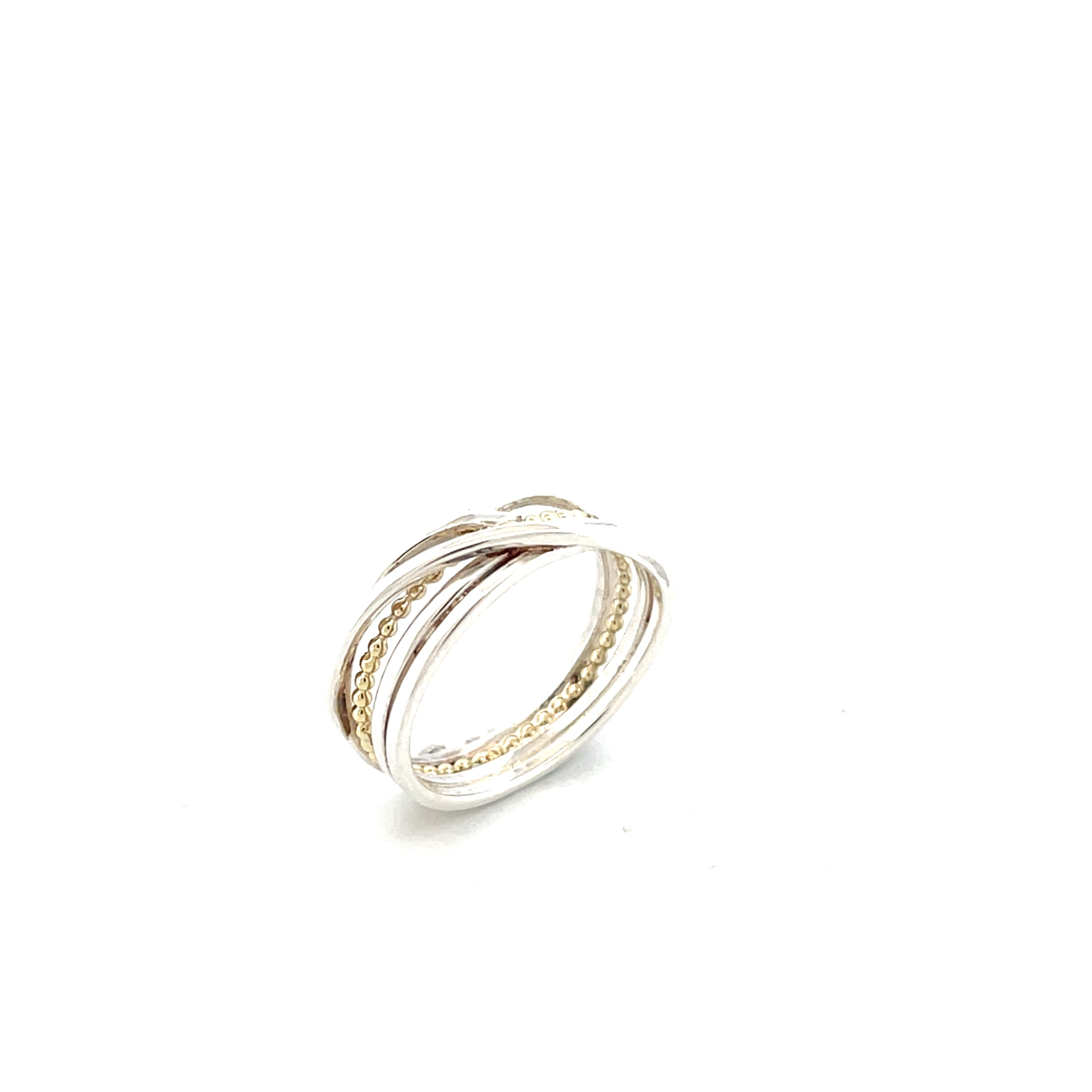 Een speelse ring van meerdere draden die een energieke wikkel van sierlijkheid vormen. Deze ring straalt om elke vinger.