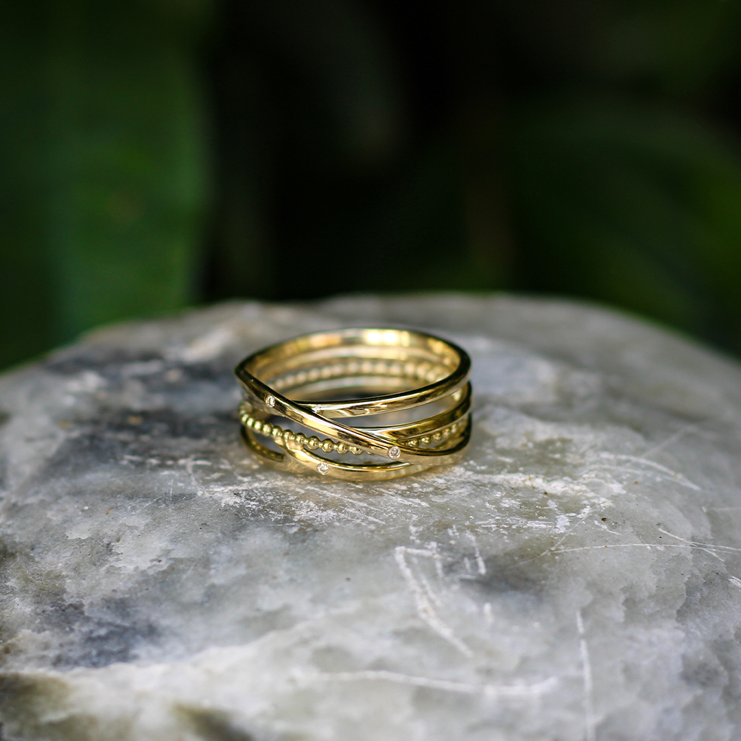 Een speelse ring van meerdere draden die een energieke wikkel van sierlijkheid vormen. Met de diamanten die erin verwerkt zijn straalt deze ring om elke vinger.