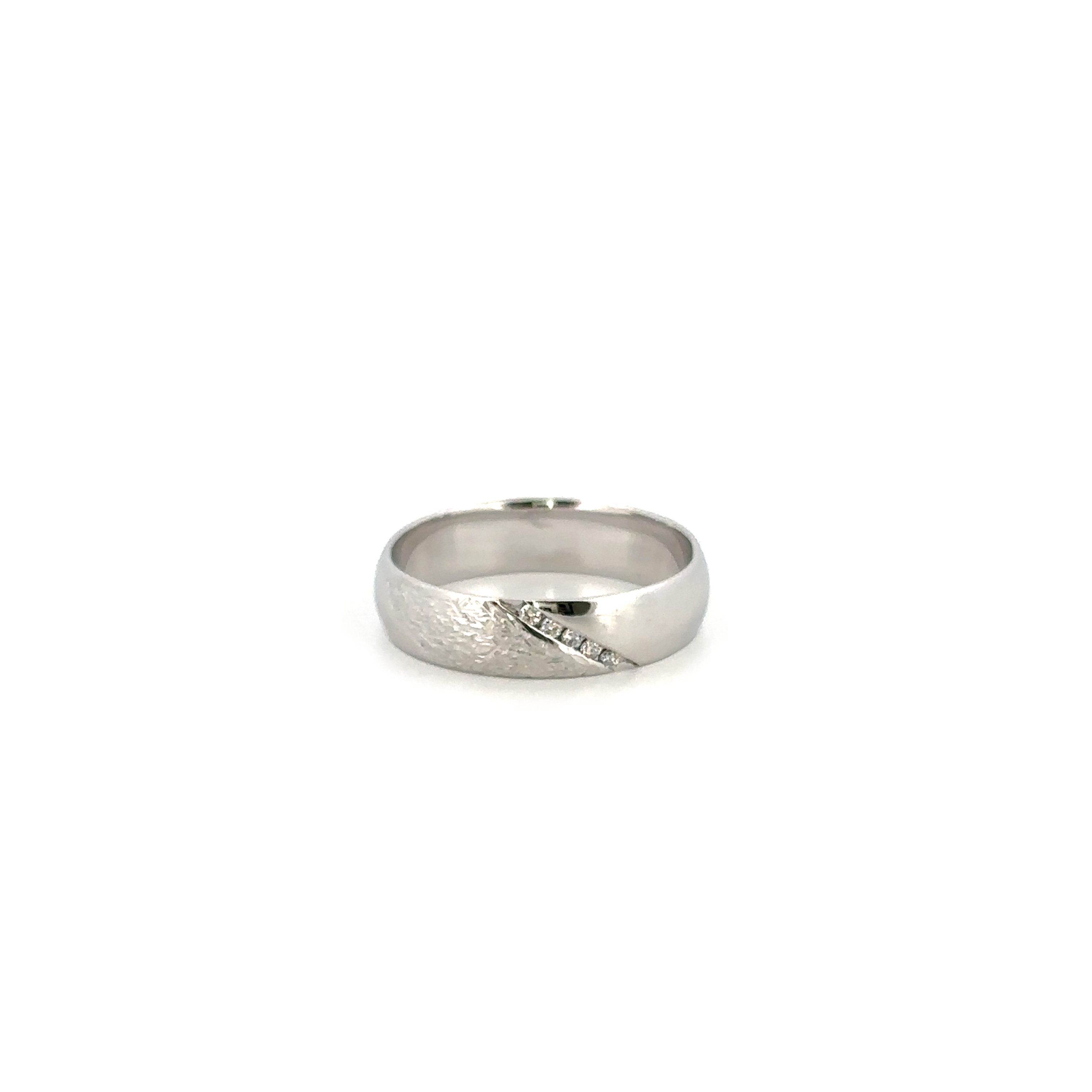 Deze prachtige ring van 5mm breed is gemaakt van 14 karaat witgoud en is bezet met vijf schitterende diamanten. De ring heeft een elegante en tijdloze uitstraling, perfect voor dagelijks gebruik of speciale gelegenheden. Draag hem alleen of combineer hem met andere ringen voor een trendy en persoonlijke look. Deze ring is een tijdloos juweel dat elke outfit compleet maakt.