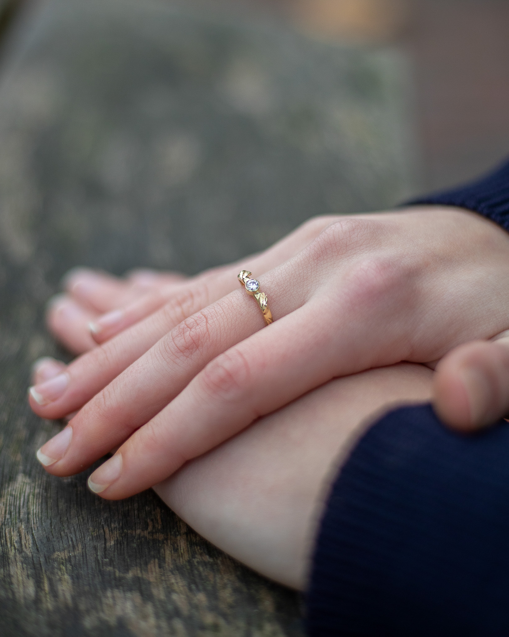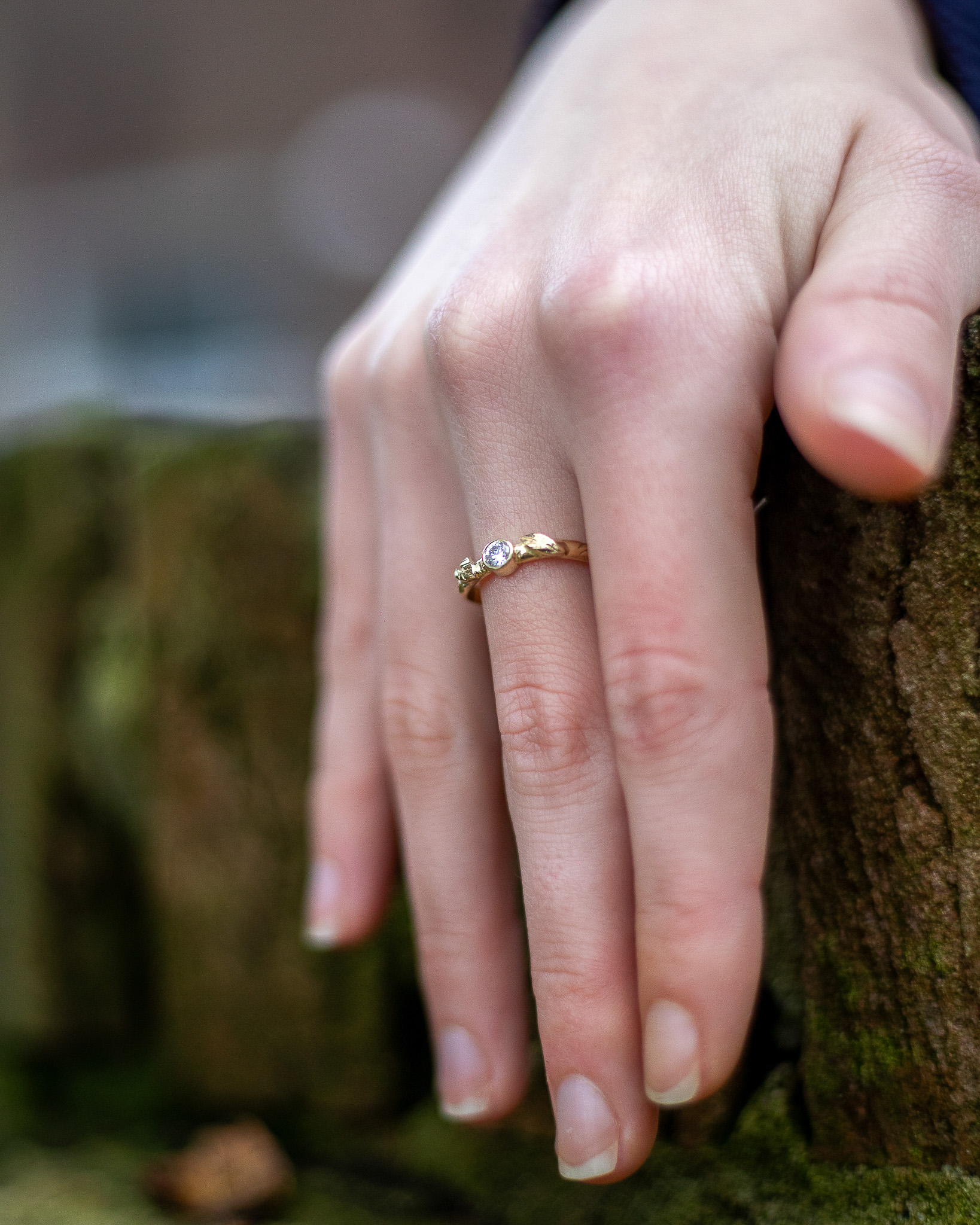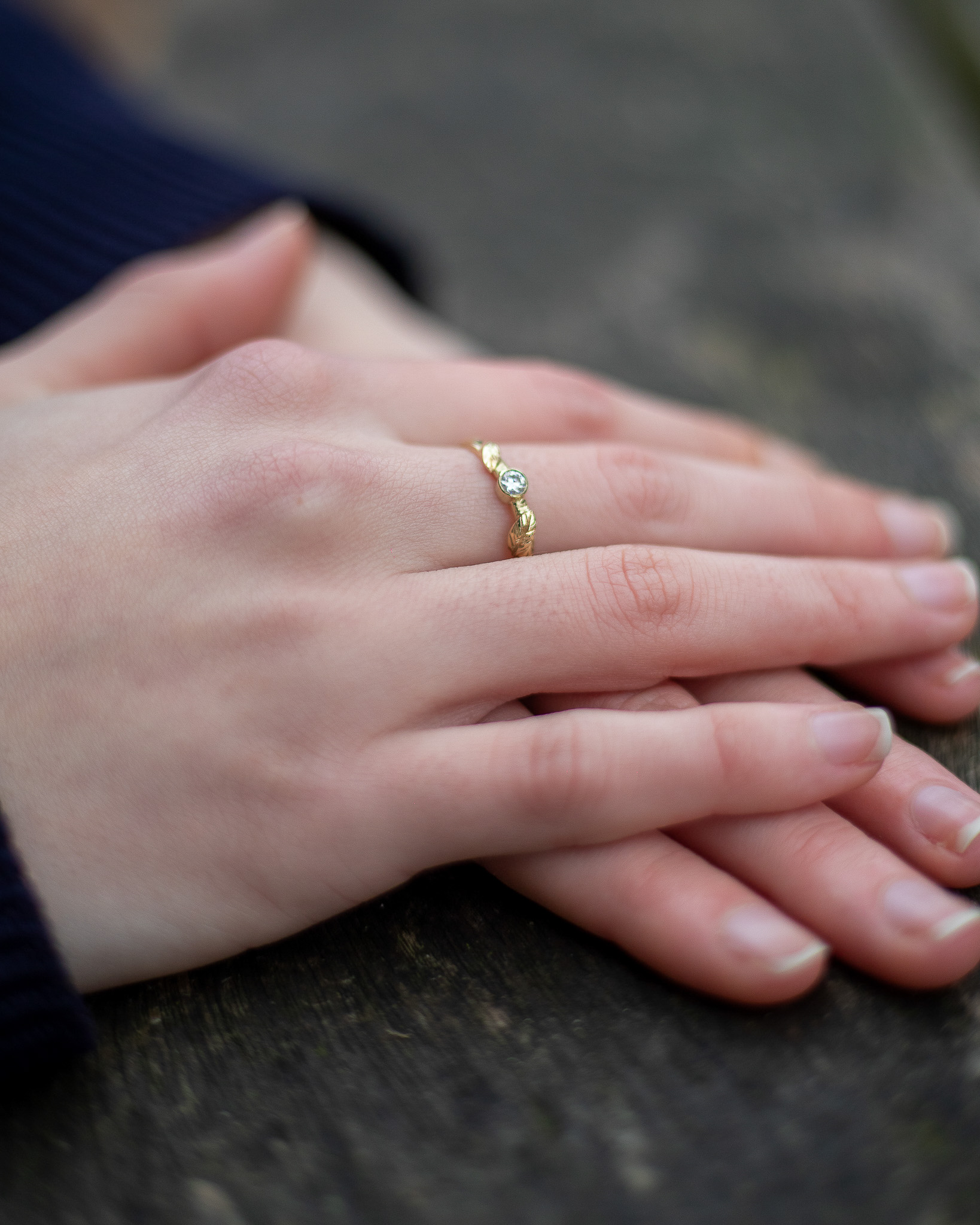 In onze serie natuurlijke sieraden is nieuw deze leuke ring met blaadjes. De mooie organische vormen zijn geïnspireerd door de natuur. De mooie moissaniet edelsteen laat haar schitteren als het zonlicht door de bladeren.