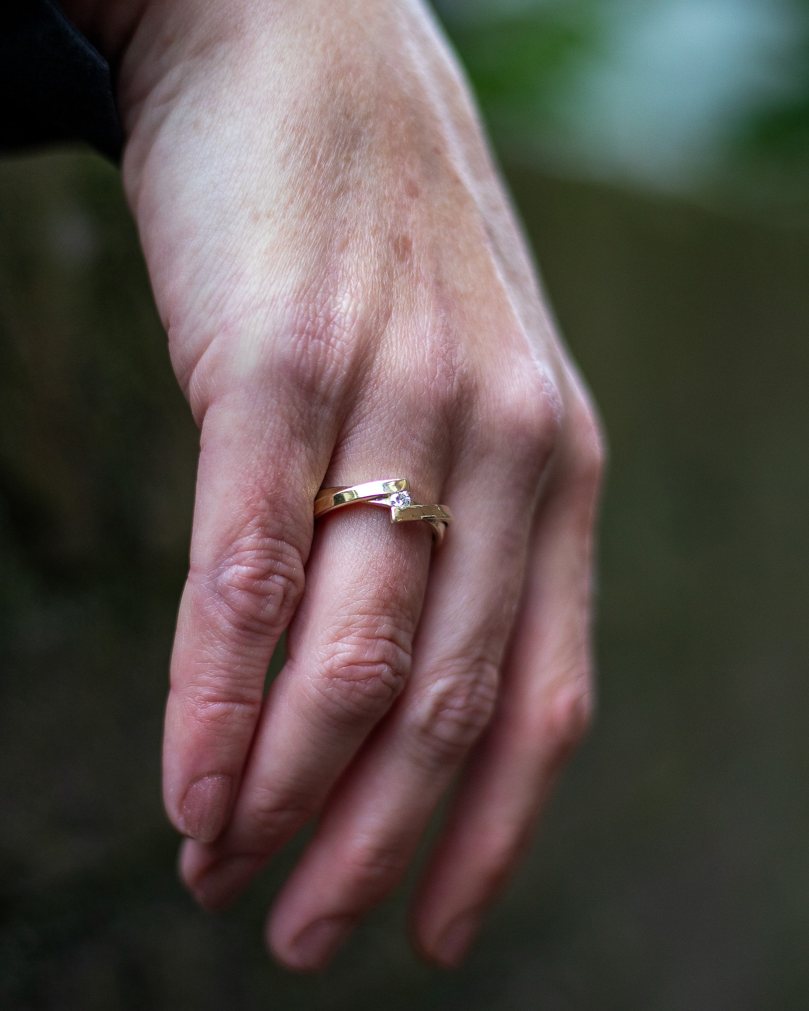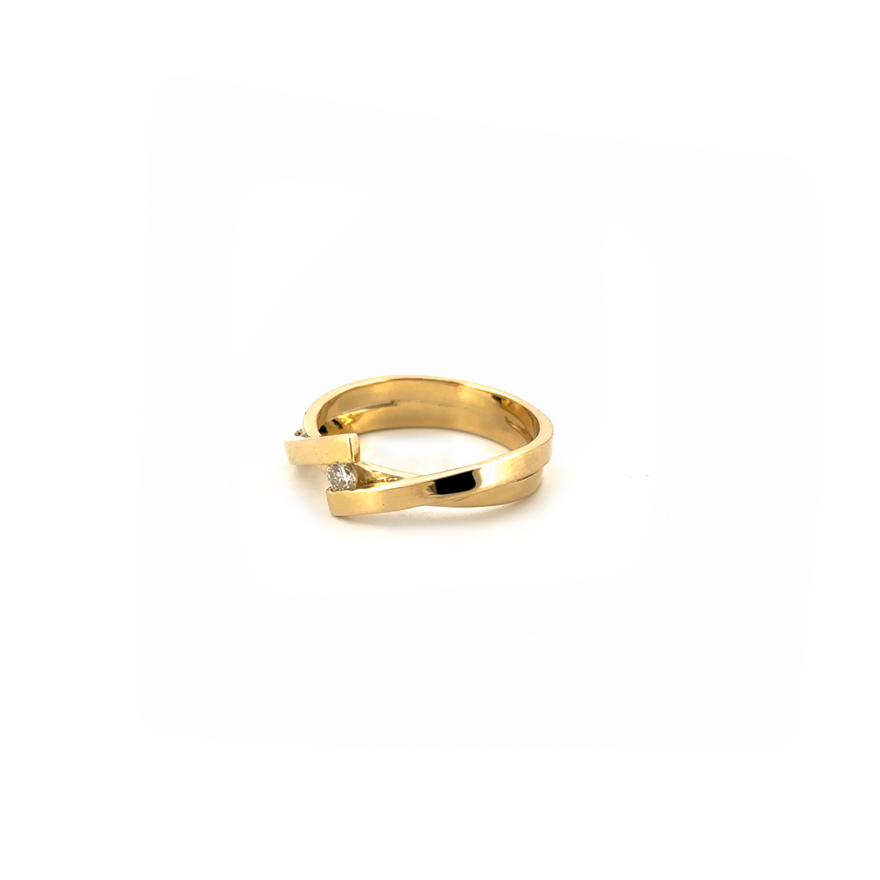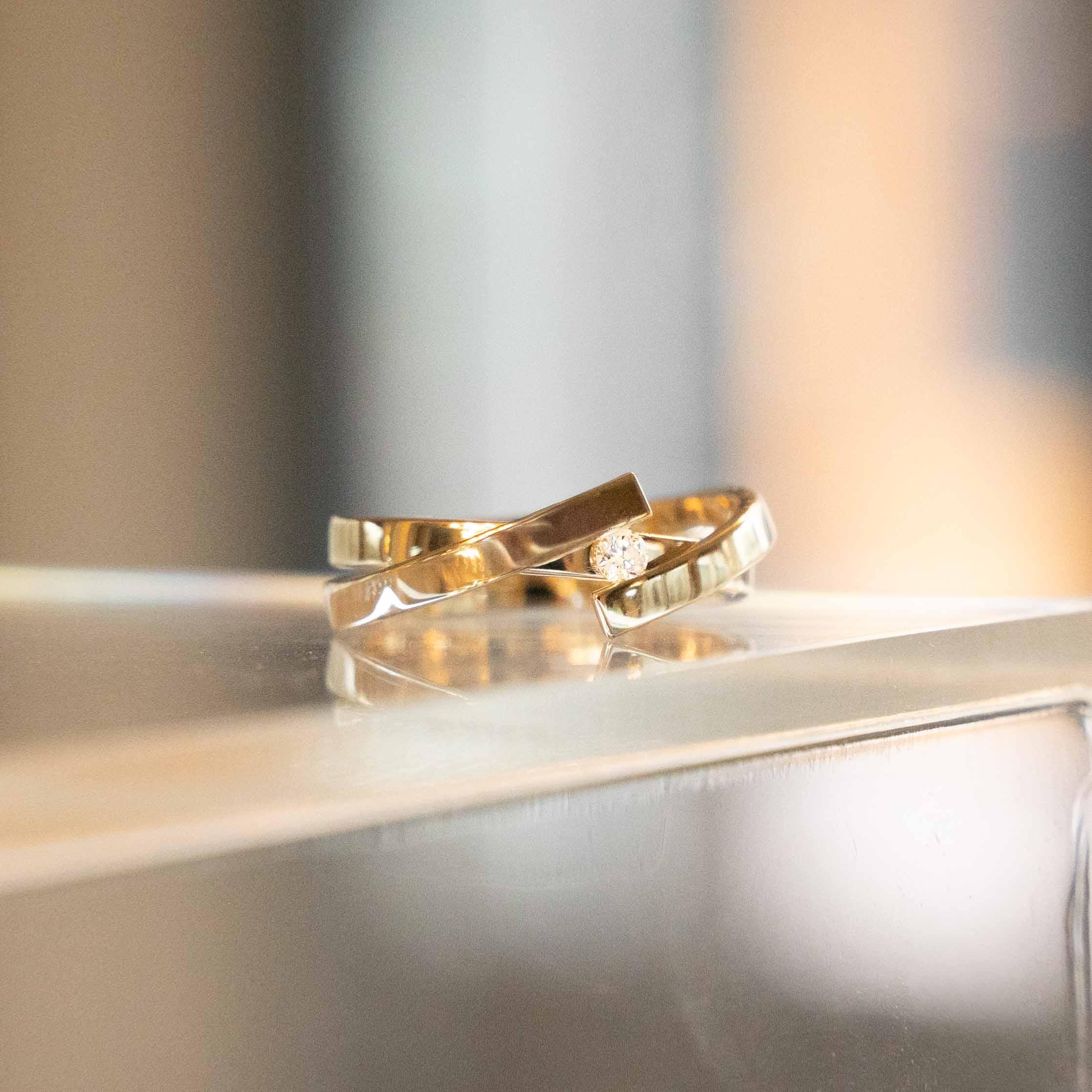 Deze geelgouden ring bestaat uit 2 verschillende delen die elkaar omarmen met in het midden een diamant.