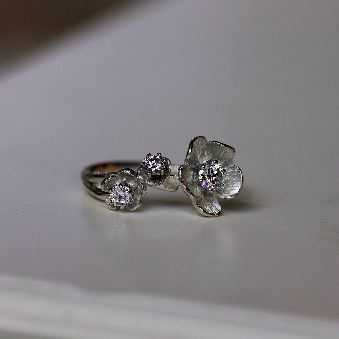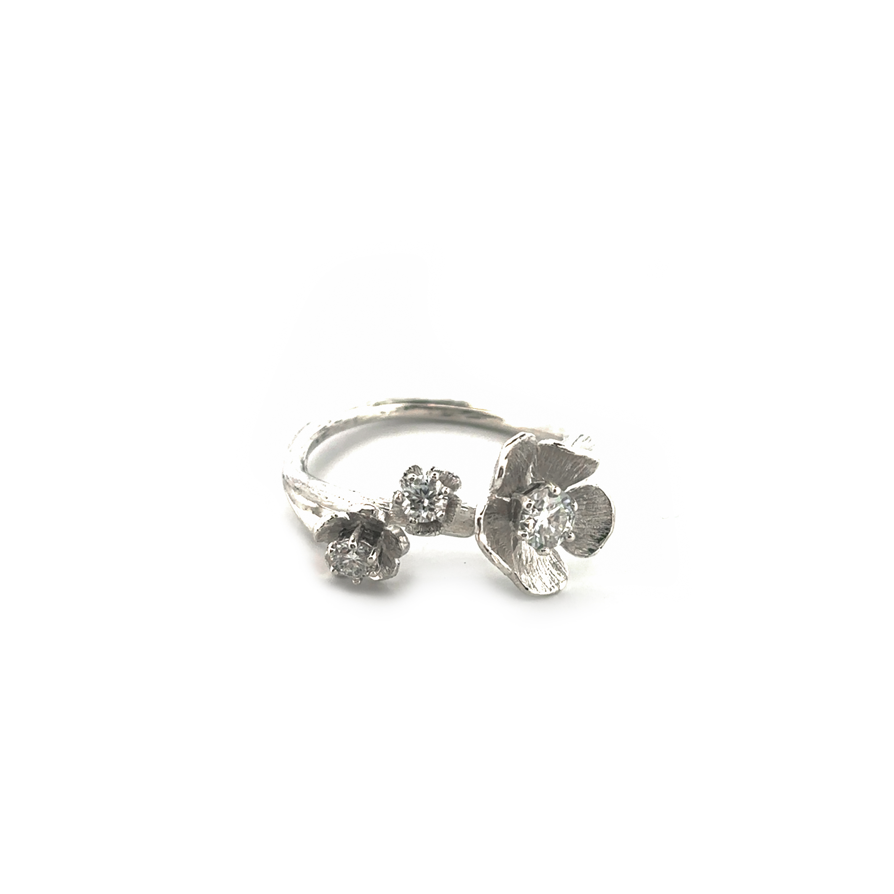 Een nieuwe variant van onze bloesem ring, nu met 3 bloemen en moissaniet edelstenen.
