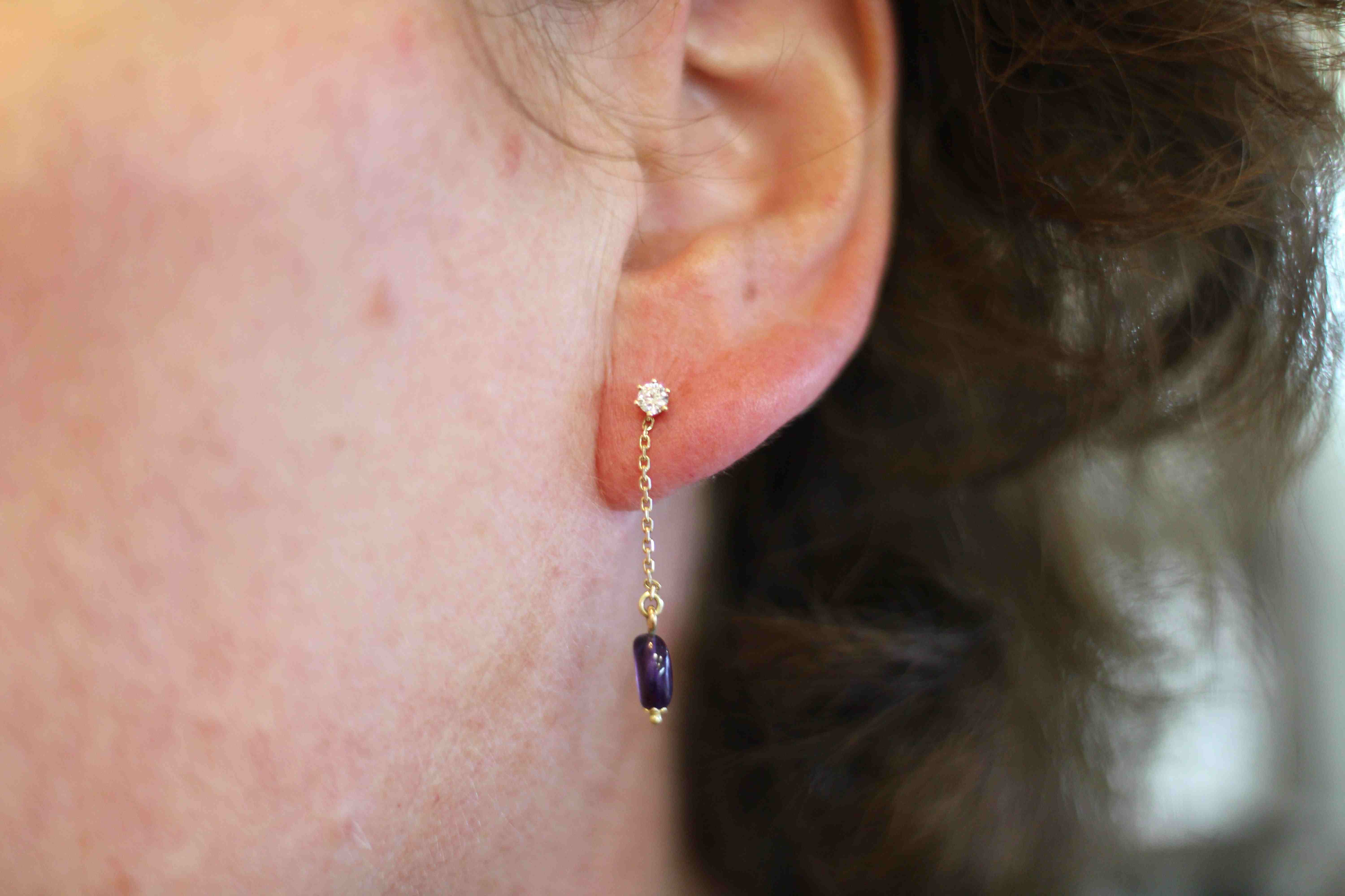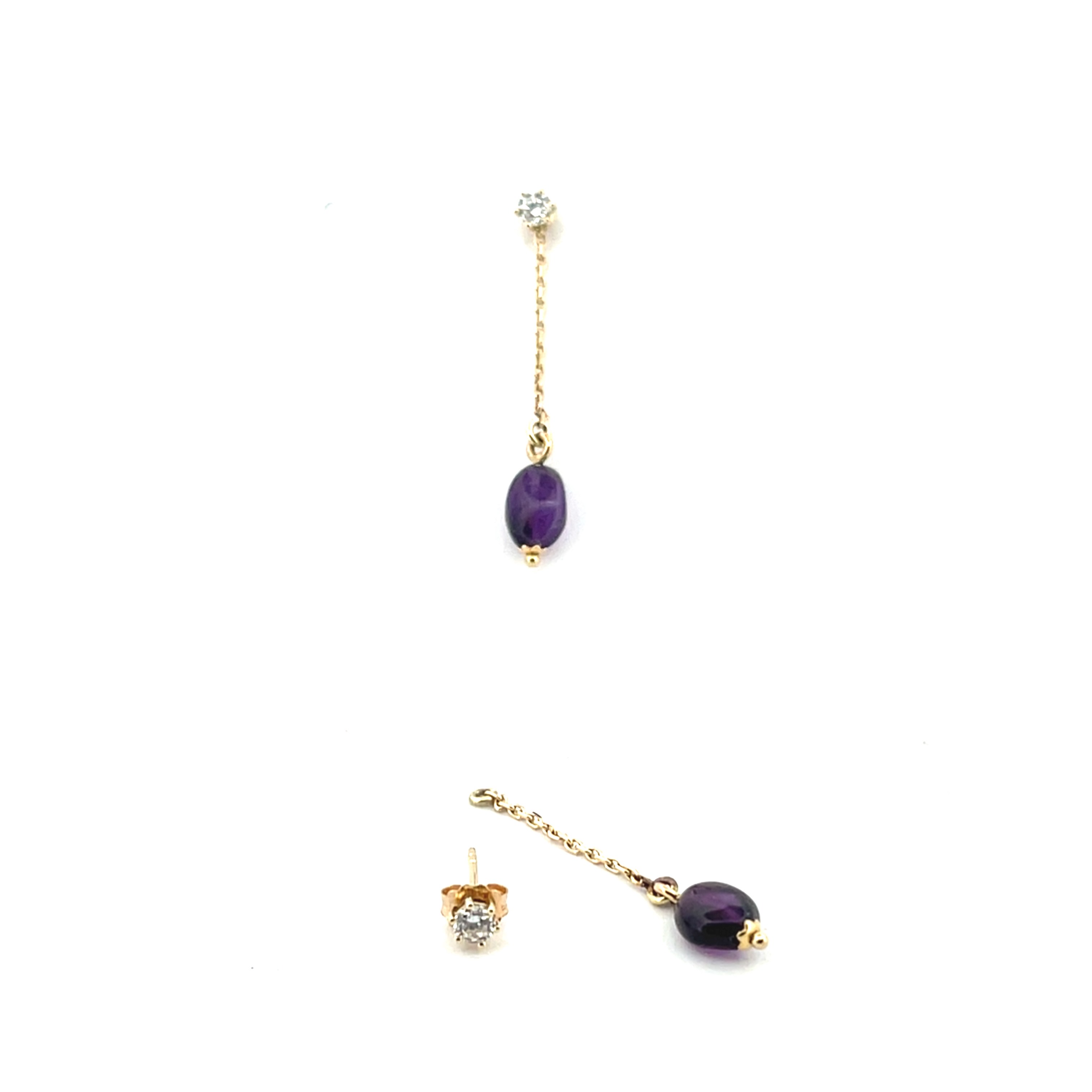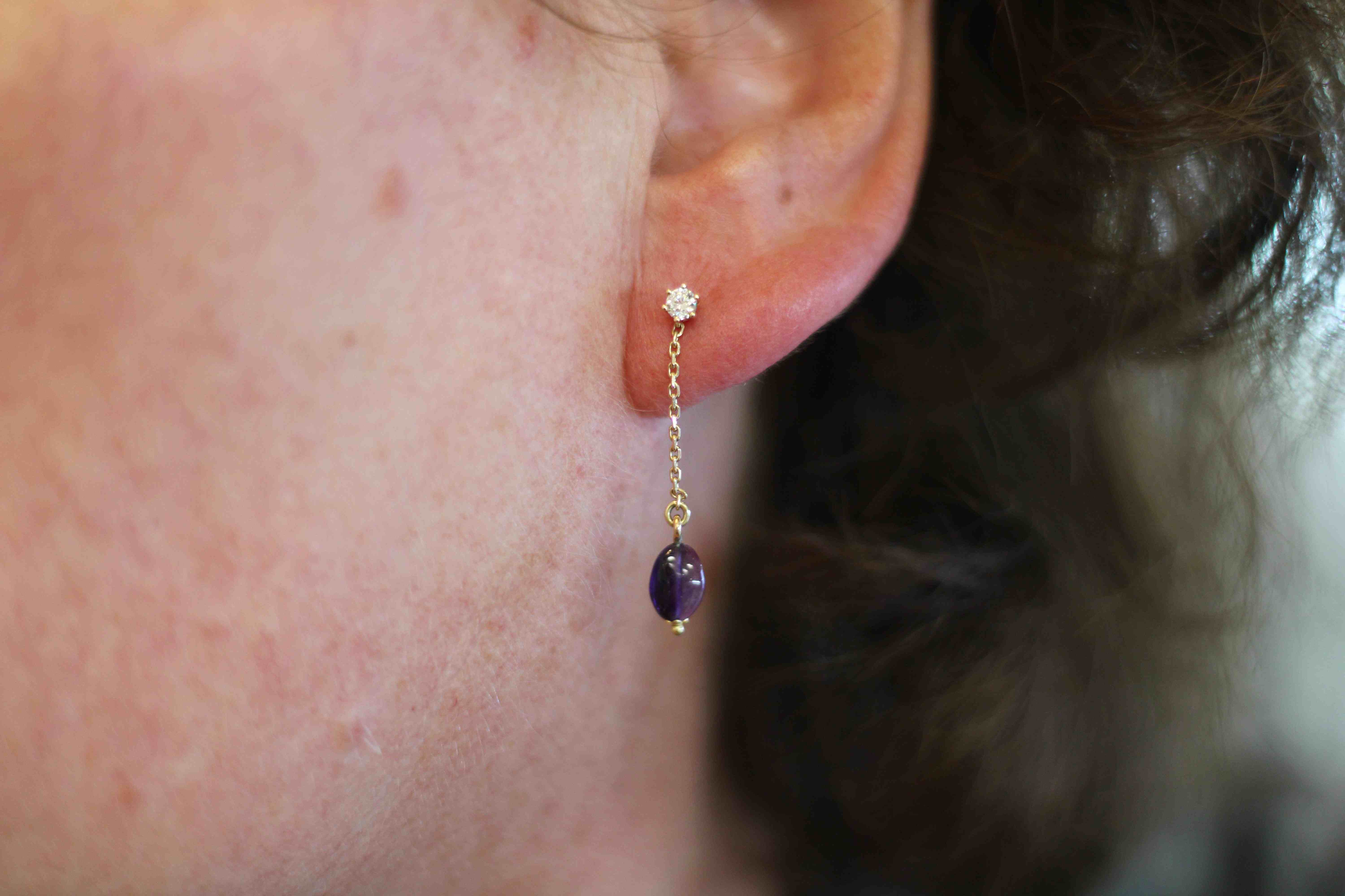 Deze sprookjesachtige hangers met los bungelende paarse edelsteen vangen de essentie van het magische in elk detail.