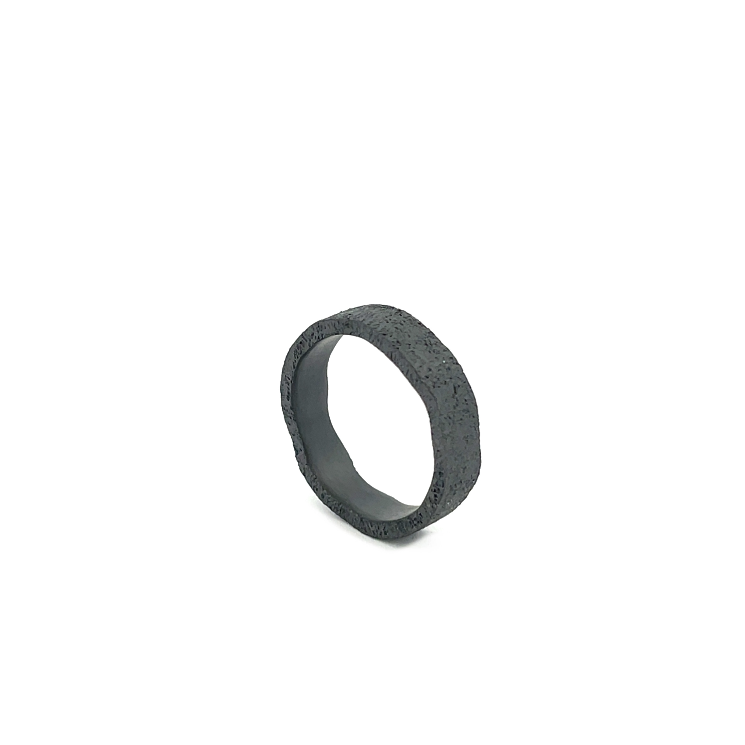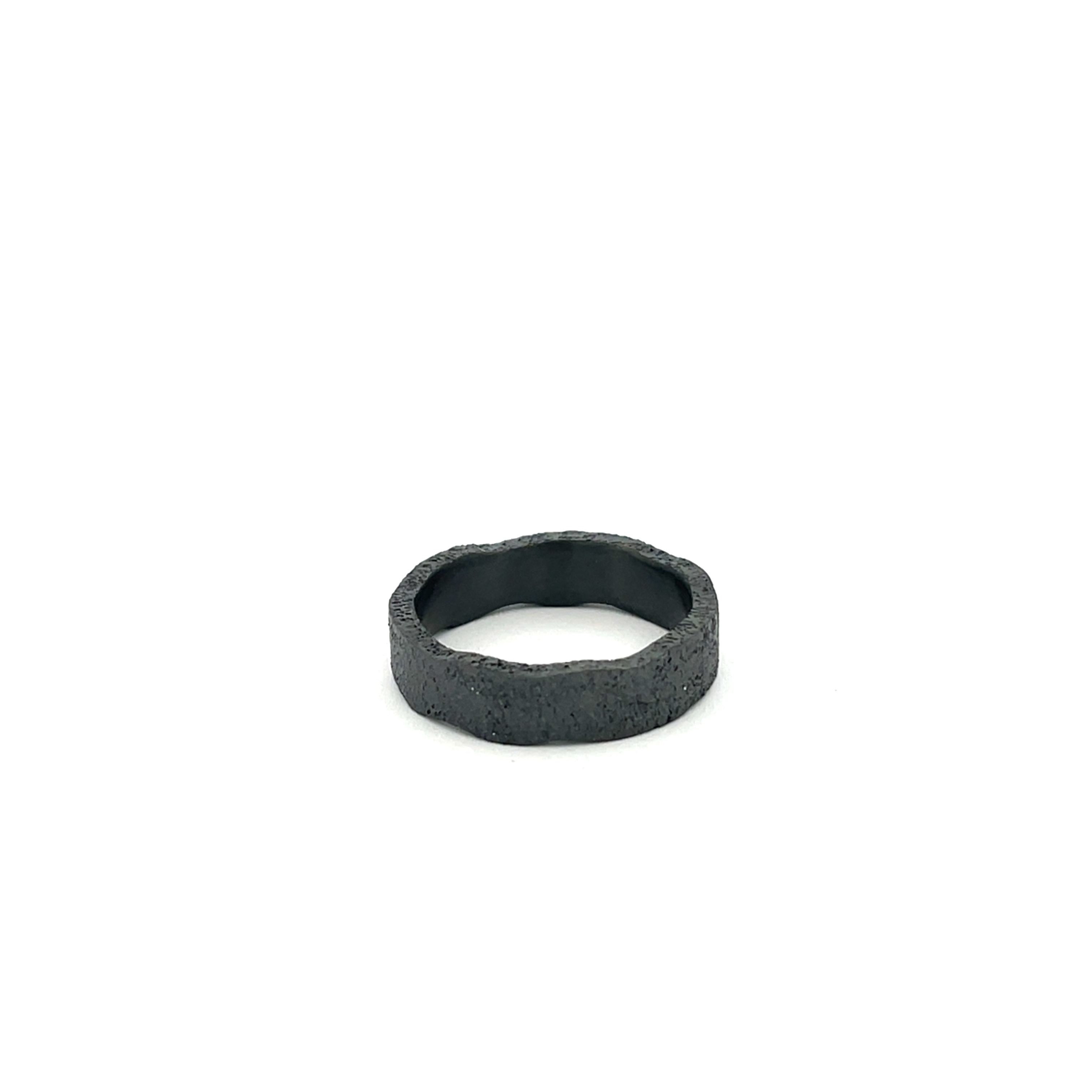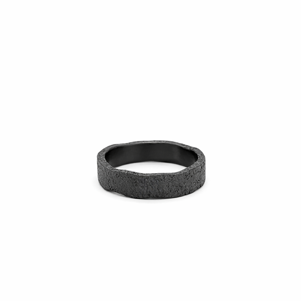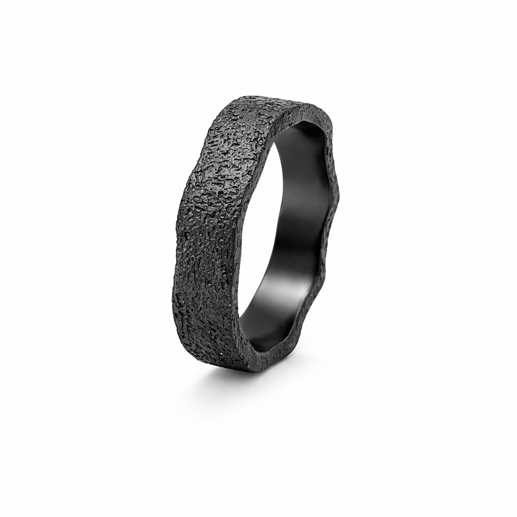 Deze bijzondere ring van zirkonium valt direct op door zijn diepe, matte zwarte kleur en organische vormgeving. De subtiel golvende rand geeft het strakke ontwerp een speels en eigenzinnig karakter, alsof de ring is gevormd door natuurlijke beweging.