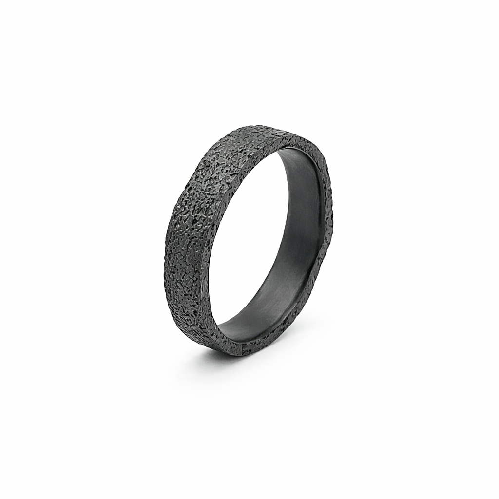 Het oppervlak heeft een robuuste, licht getextureerde afwerking die mooi contrasteert met de gladde binnenzijde. Zirkonium staat bekend om zijn sterke, duurzame eigenschappen en het comfortabele draaggevoel. Bovendien behoudt het materiaal zijn intense zwarte kleur langdurig.