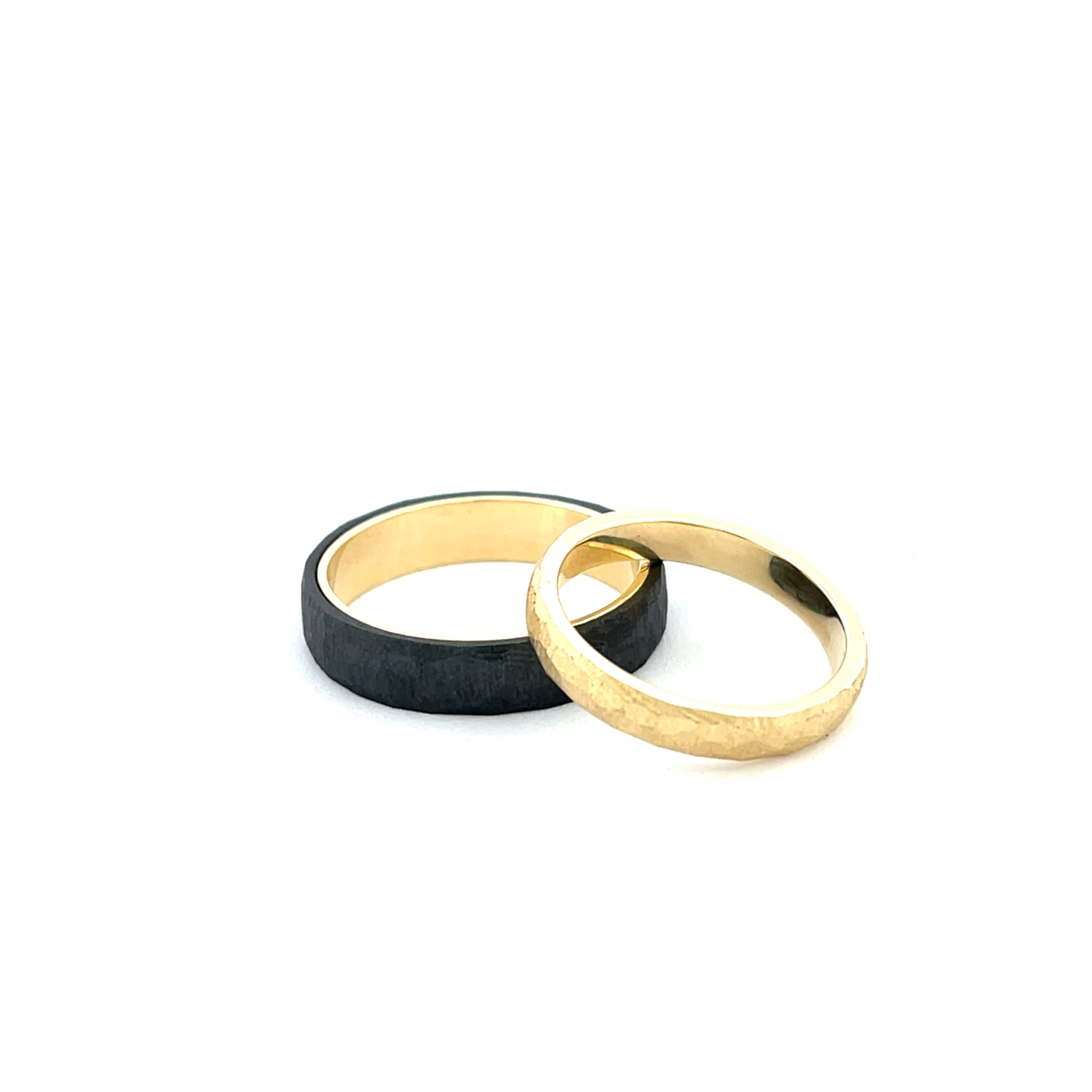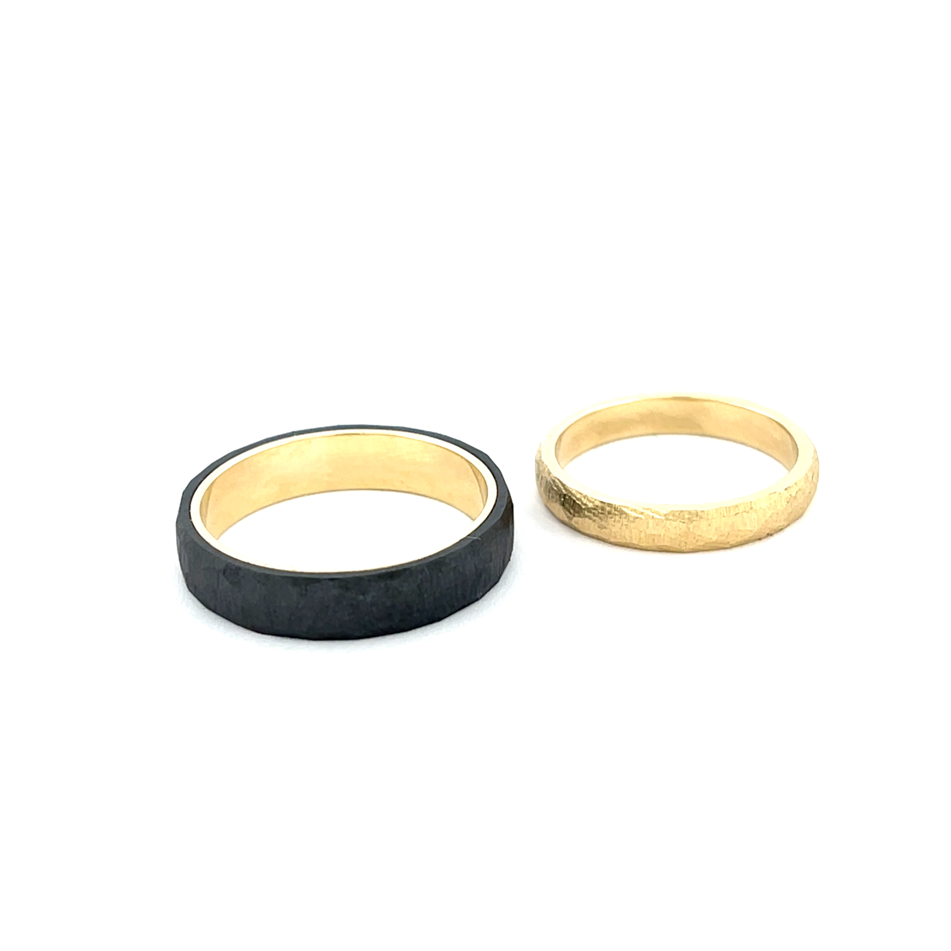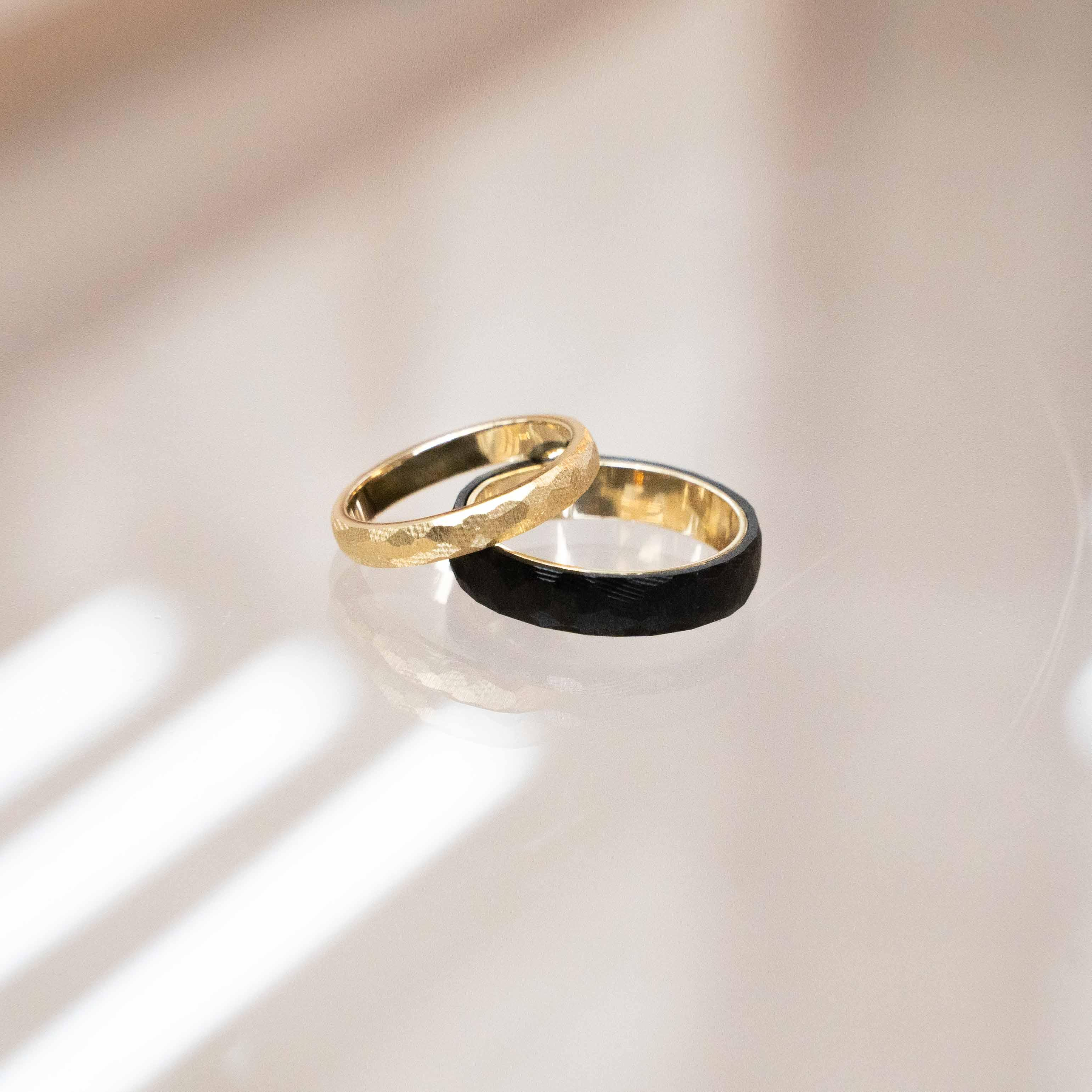 Deze volledig gouden ring straalt pure warmte en ambacht uit. De met de hand gevijlde facetten geven het oppervlak een levendig karakter, waarbij het licht telkens anders wordt gevangen. Geen gladde perfectie, maar een subtiele, organische structuur die de ring een unieke uitstraling geeft.