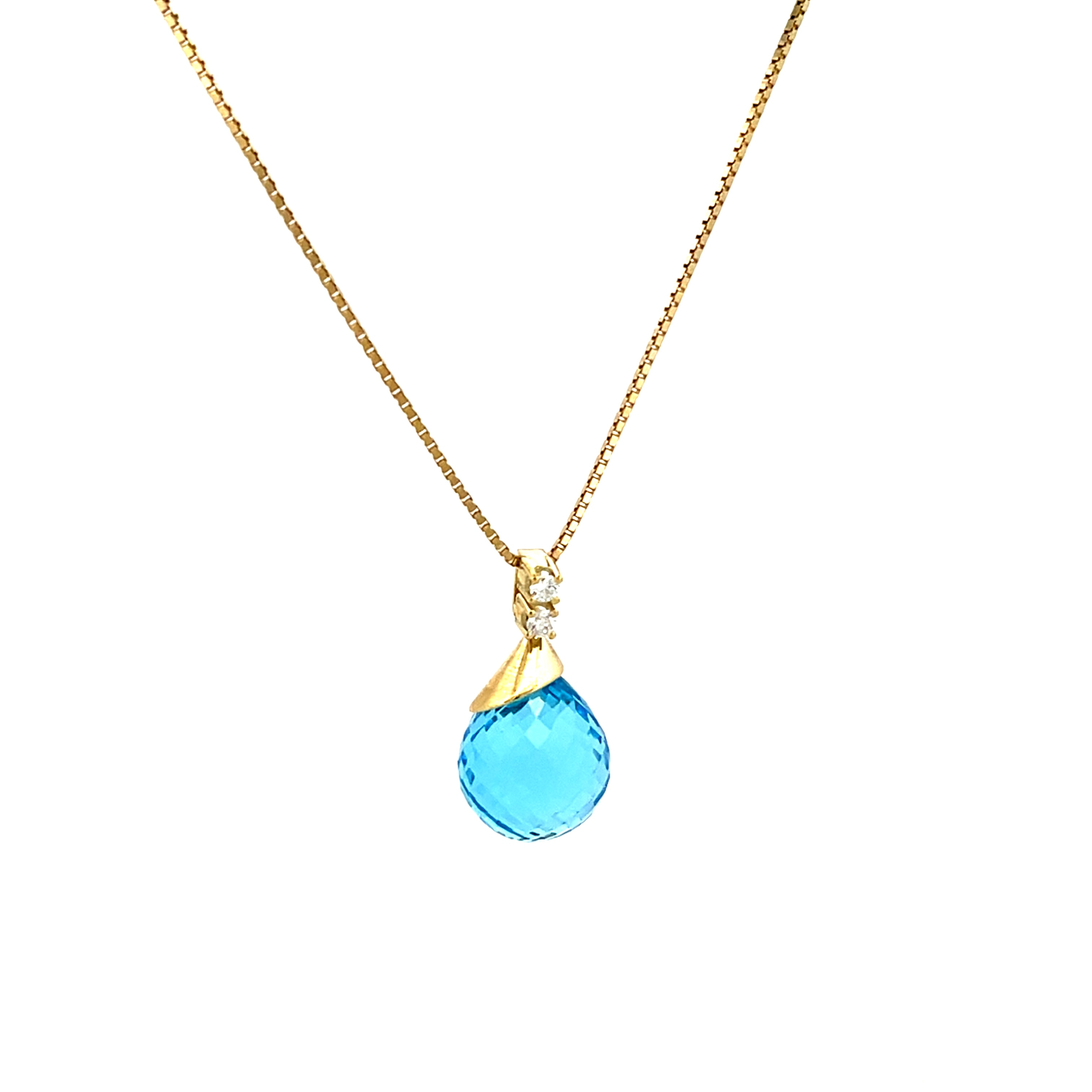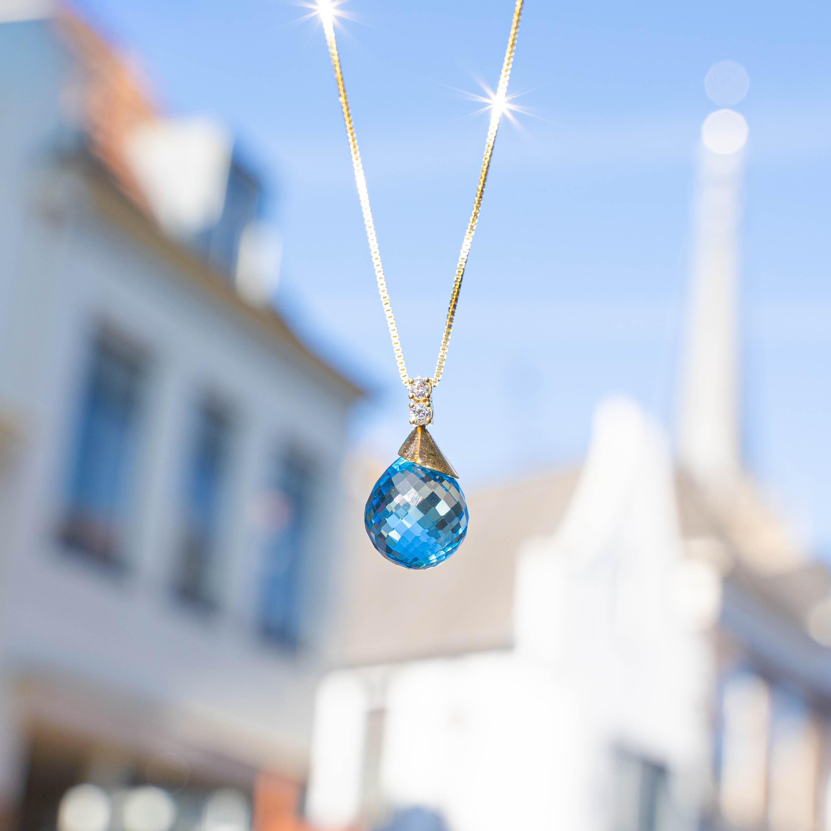 Een verfijnde hanger waarin licht en kleur samenkomen. Twee fonkelende labdiamanten vormen een elegante overgang naar een helderblauwe topaas in druppelvorm, die mooi het licht vangt bij elke beweging. Het warme goud accentueert de frisse tint van de steen en geeft het geheel een tijdloze, luxueuze uitstraling.