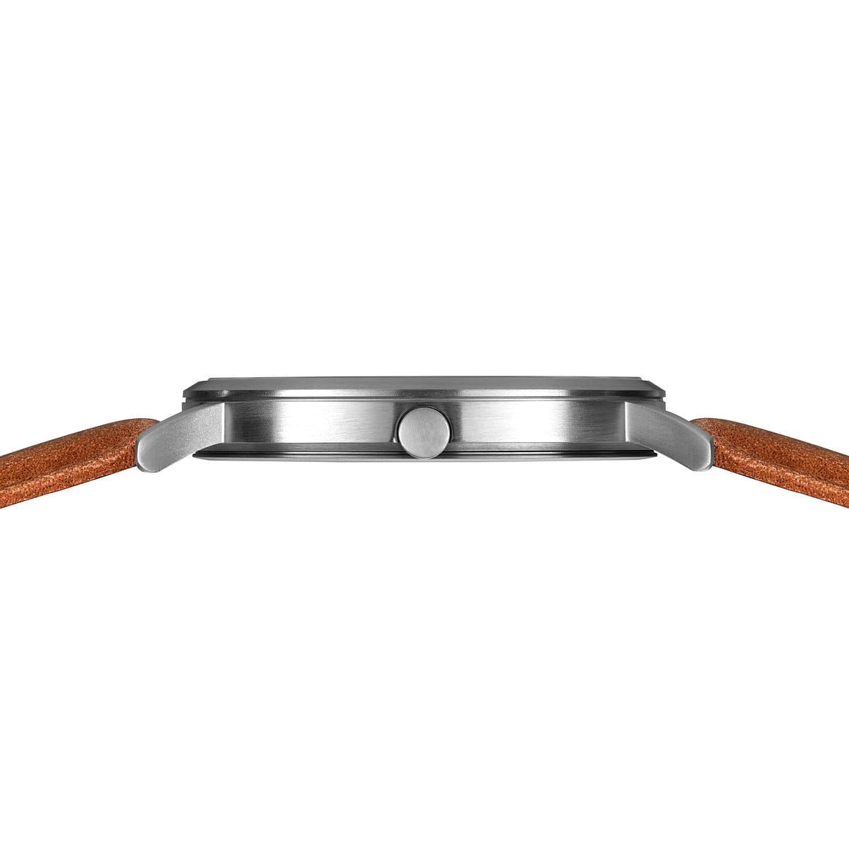 De geborstelde titanium kast meet 40 mm en is slechts 7 mm hoog – ultralicht en hypoallergeen, perfect voor dagelijks gebruik. Het platte saffierglas is krasbestendig en duurzaam. De lichtbruine kalfsleren band zorgt voor een warm contrast en sluit met een klassieke gesp.