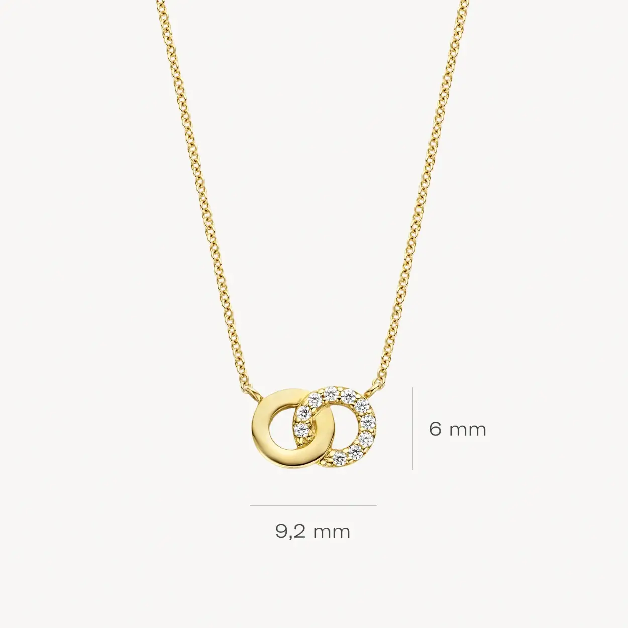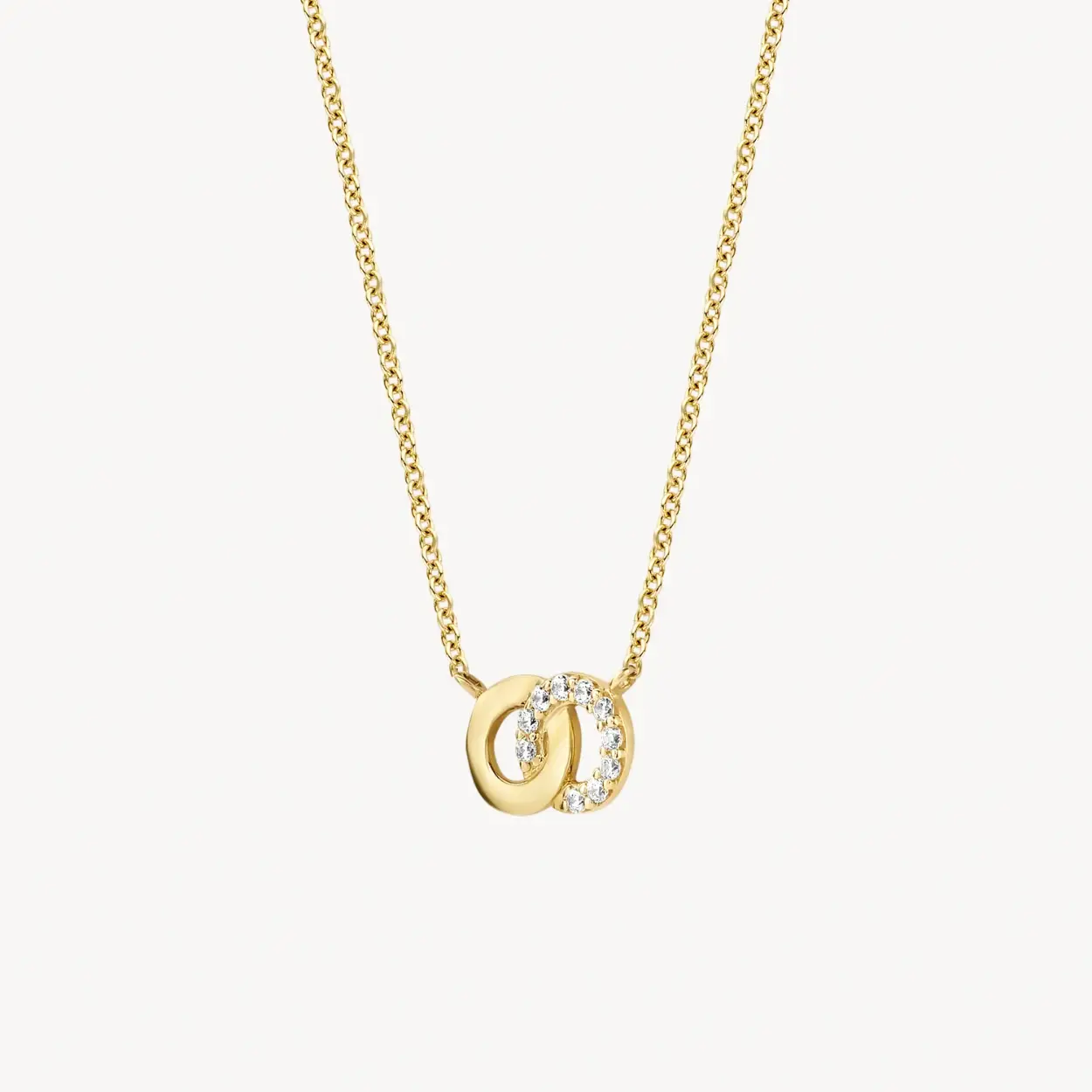 In dit bijzondere 14k geelgouden collier grijpen twee ringen in elkaar. Een van de ringen is bezet met zirkonia’s die gezet zijn in een pavé zetting. Het collier heeft een totale lengte van 42 cm. Een prachtig sieraad om cadeau te doen aan een geliefde of aan jezelf.