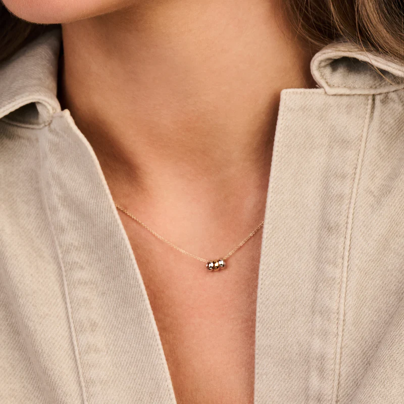 Deze geel gouden ketting heeft een lengte van 42 centimeter. Aan de ketting zijn drie afzonderlijk bewegende, ronde, glanzend gepolijste hangers geplaatst. De bedels zijn uitgevoerd in geel goud en witgoud. Iedere hanger is 2 millimeter breed en heeft een doorsnede van 4,5 millimeter. Deze ketting vormt een stijlvolle en tijdloze combinatie met bijpassende gedraaide oorstekers 7157.