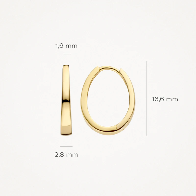 Deze eenvoudige, gladde, ovaalvormige 14k geelgouden oorringen zijn het summum van klassieke stijl. Ze hebben een lengte van 16,6 mm en zijn mooi te combineren met andere (oor)sieraden uit onze collectie.