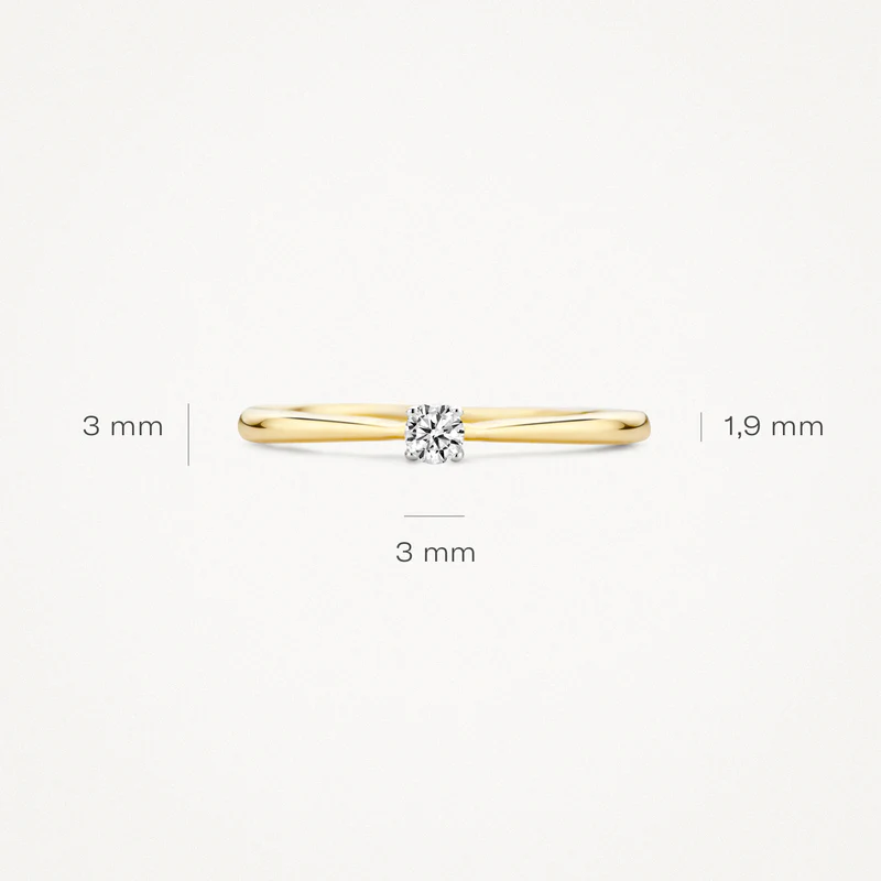 Een zirkonia in chatonzetting siert deze elegante ring van 14k wit -en geelgoud. De band is 1,8 mm breed en de steen heeft een doorsnede van 3 mm. Leuk om te mixen en matchen met andere ringen uit onze collectie.