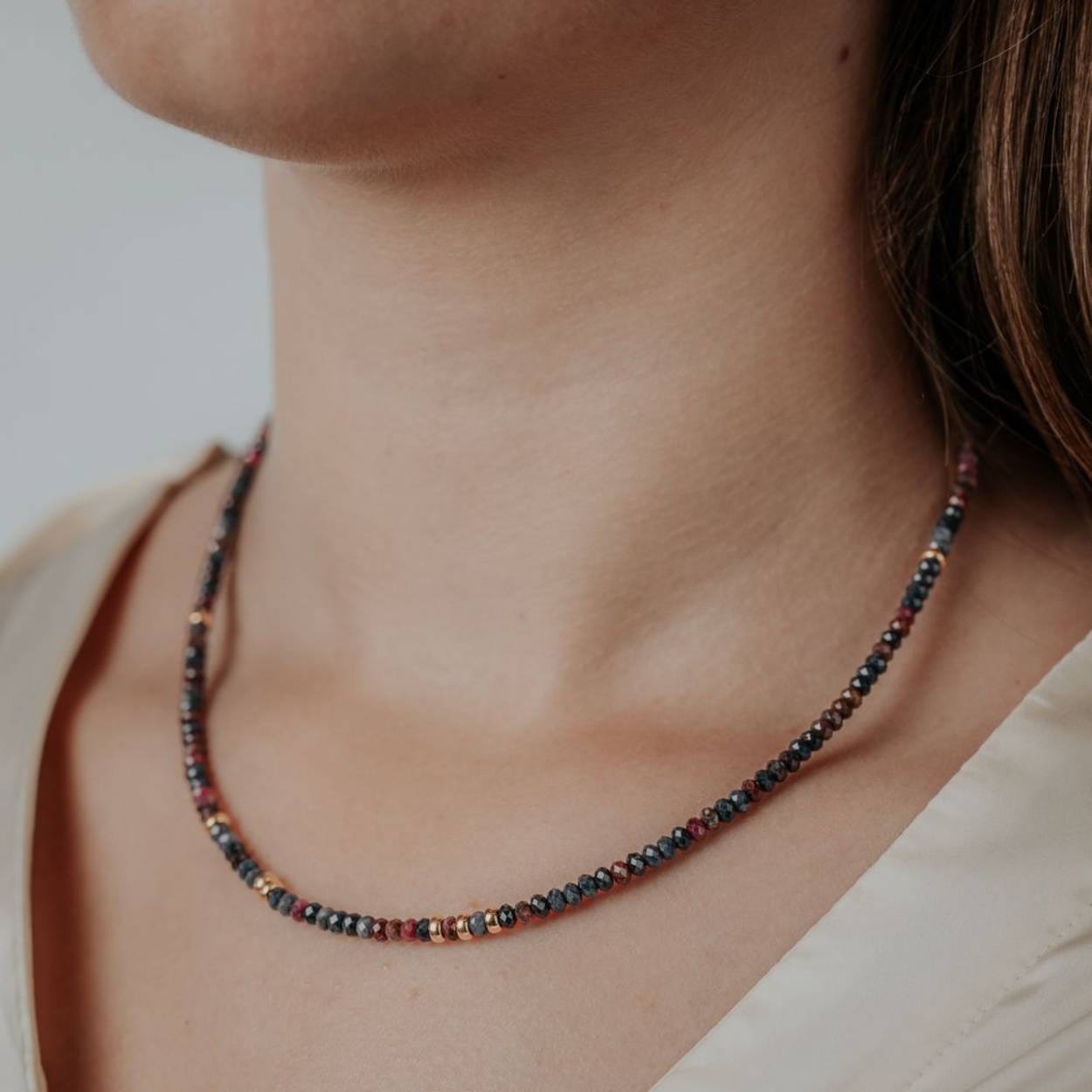 Collier gemaakt van Goldfilled in combinatie met de edelsteen Saffier. Saffier is de steen van wijsheid. Deze steen biedt ondersteuning bij problemen met communicatie. Daarnaast helpt hij je jezelf te begrijpen. Draag dit collier met de bijpassende armband voor een complete look!