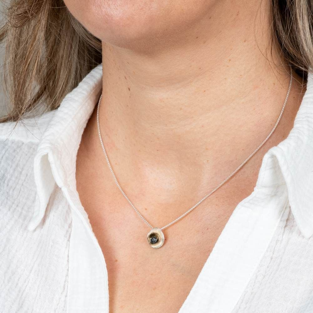 Collier gemaakt van 925 sterling zilver, met daaraan vast een hanger van 925 sterling zilver, geoxideerd zilver en zilver verguld. De hanger bestaat uit 3 verschillende kleuren ronde lagen opgestapeld van groot naar klein. Combineer de hanger met de bijpassende oorstekers.