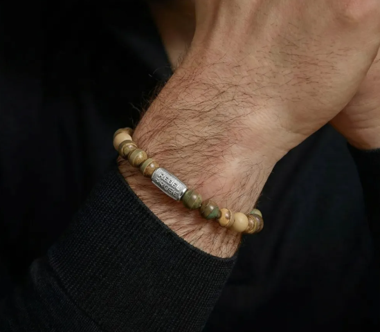 Bead armband, handgemaakt van 8mm Agaat en Fossil stenen met een zilverkleurige edelstalen sluiting. Het Rebel & Rose sieraad is makkelijk te combineren met andere zilveren, leren of kralenarmbanden.