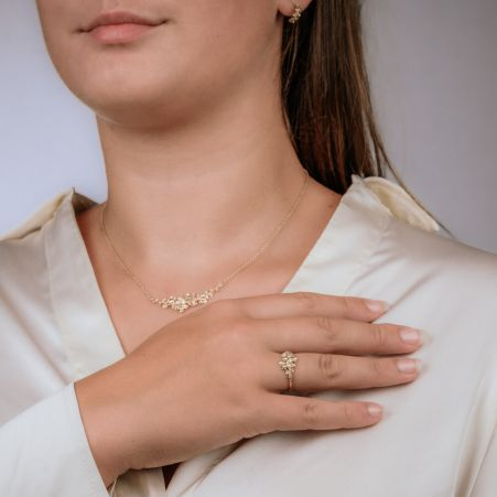 Bloesem ring van Jeh Jewels gemaakt van 14 karaat goud, in de ring zit een diamant. De gouden sieradenlijn van Jéh is gemaakt van 14 karaats goud. Dit karaatgehalte wordt in Nederland het meest gebruikt, vanwege de hardheid en de kleur. Puur goud is te zacht om draagbare sieraden van te maken, daarom worden er bij metalen gebruikt. Vaak wordt er zilver en koper gebruikt zodat je kunt blijven spreken van 'edele metalen'. Bij 14 karaat goud zijn er van de 1000 delen, 585 delen puur goud. De overige 415 delen bestaan dus uit de overige metalen.