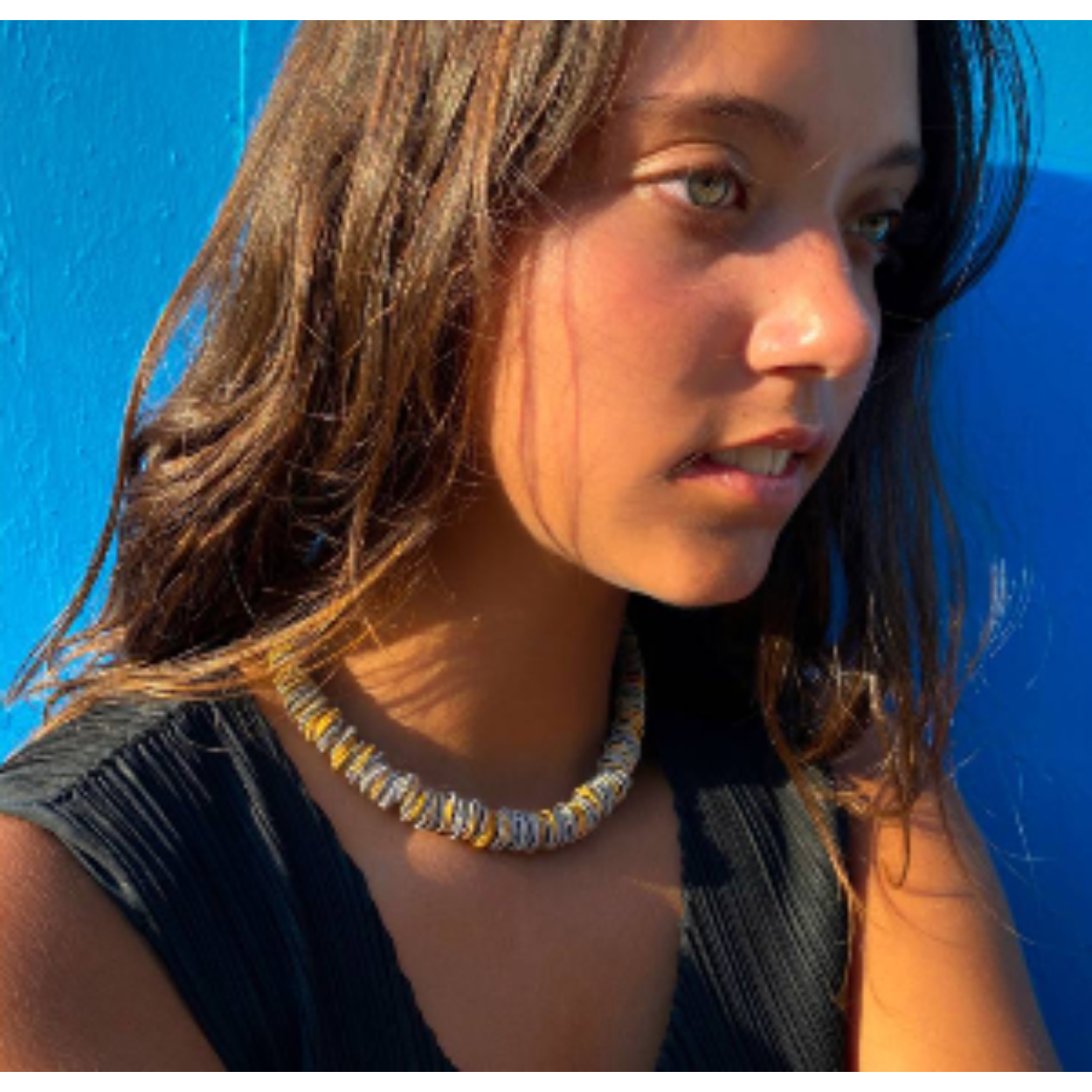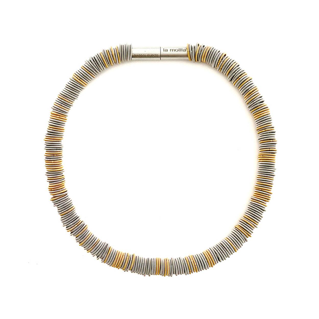 Mooi design collier van rvs staal en veer van La Mollla in grijs en geel goud met magneetsluiting