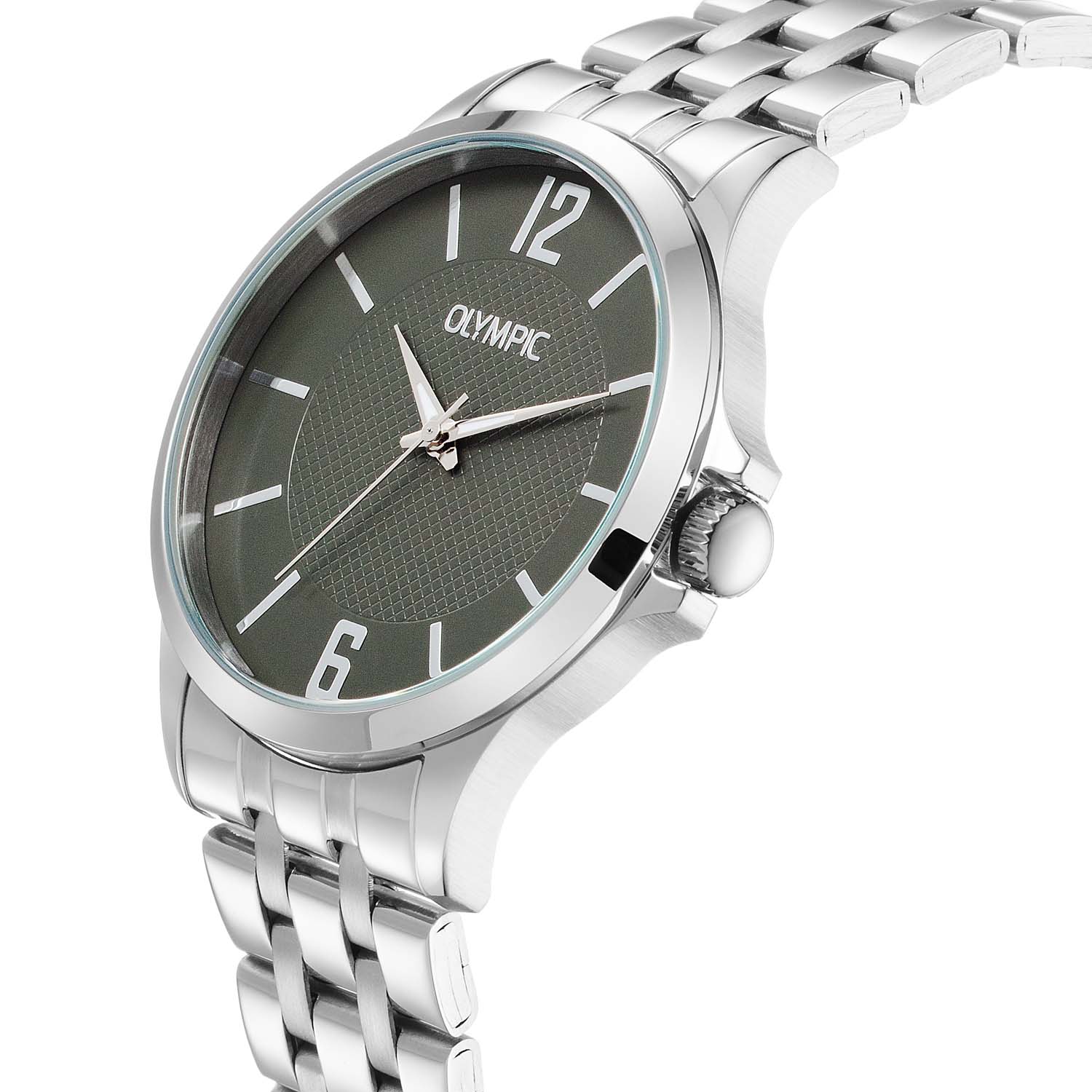 Dit unieke Olympic horloge met artikelnummer: OL72HSS403 is een herenhorloge met een classic sportieve uitstraling. Het horloge heeft een ronde stalen kast met een groene wijzerplaat met de 12 en de 6 en streepjes. Aan de kast zit een zilverkleurige stalen schakelband met vouwsluiting. Het horloge heeft een mineraalglas, een doorsnee van 40mm en is 5ATM.