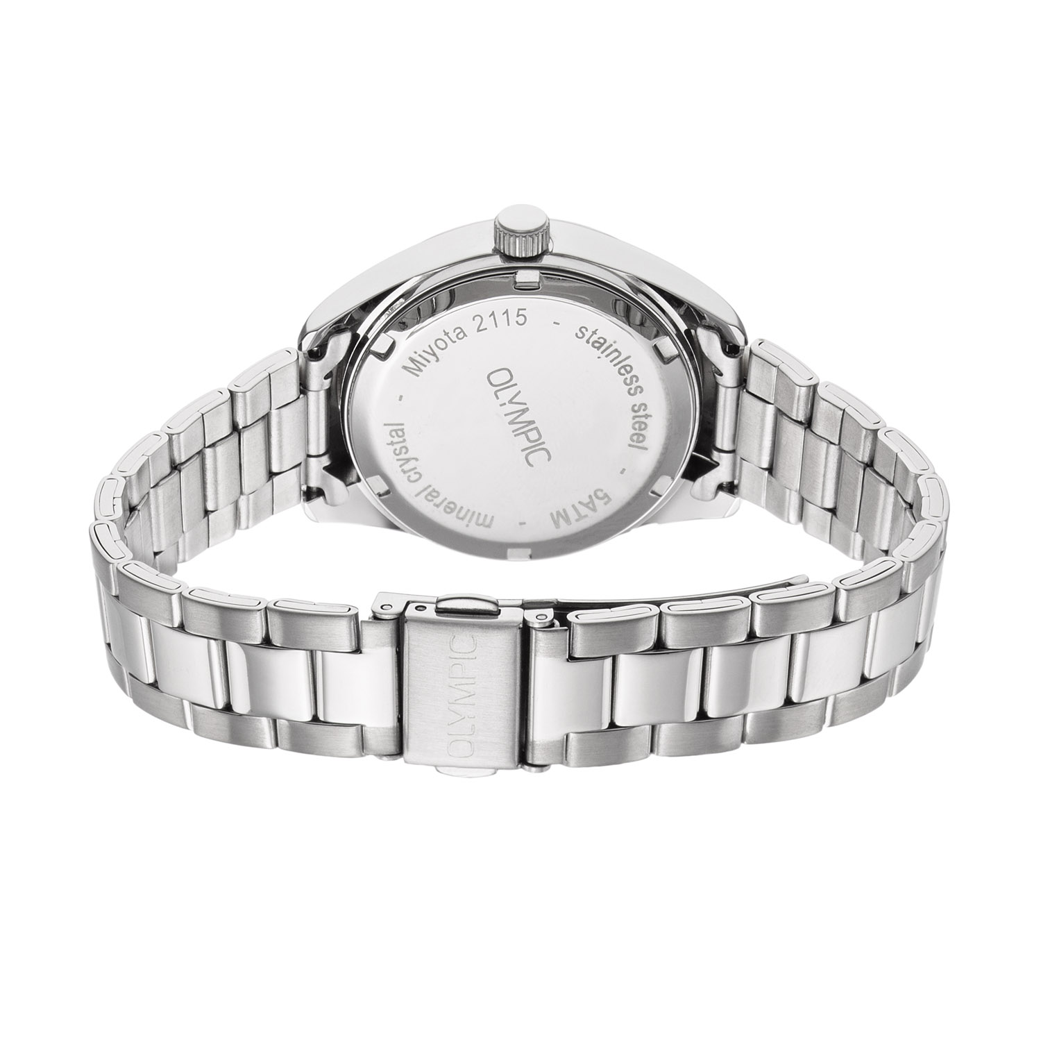Dit unieke Olympic horloge met artikelnummer: OL75DSS002 is een classic dameshorloge. Het horloge heeft een stalen kast met een glanzende bezel, een roze wijzerplaat met streepjes als uursaanduiding en een datum. Aan de kast zit een stalen schakelband met een vouwsluiting. Het horloge heeft een mineraalglas, een doorsnee van 33mm en is 5ATM.
