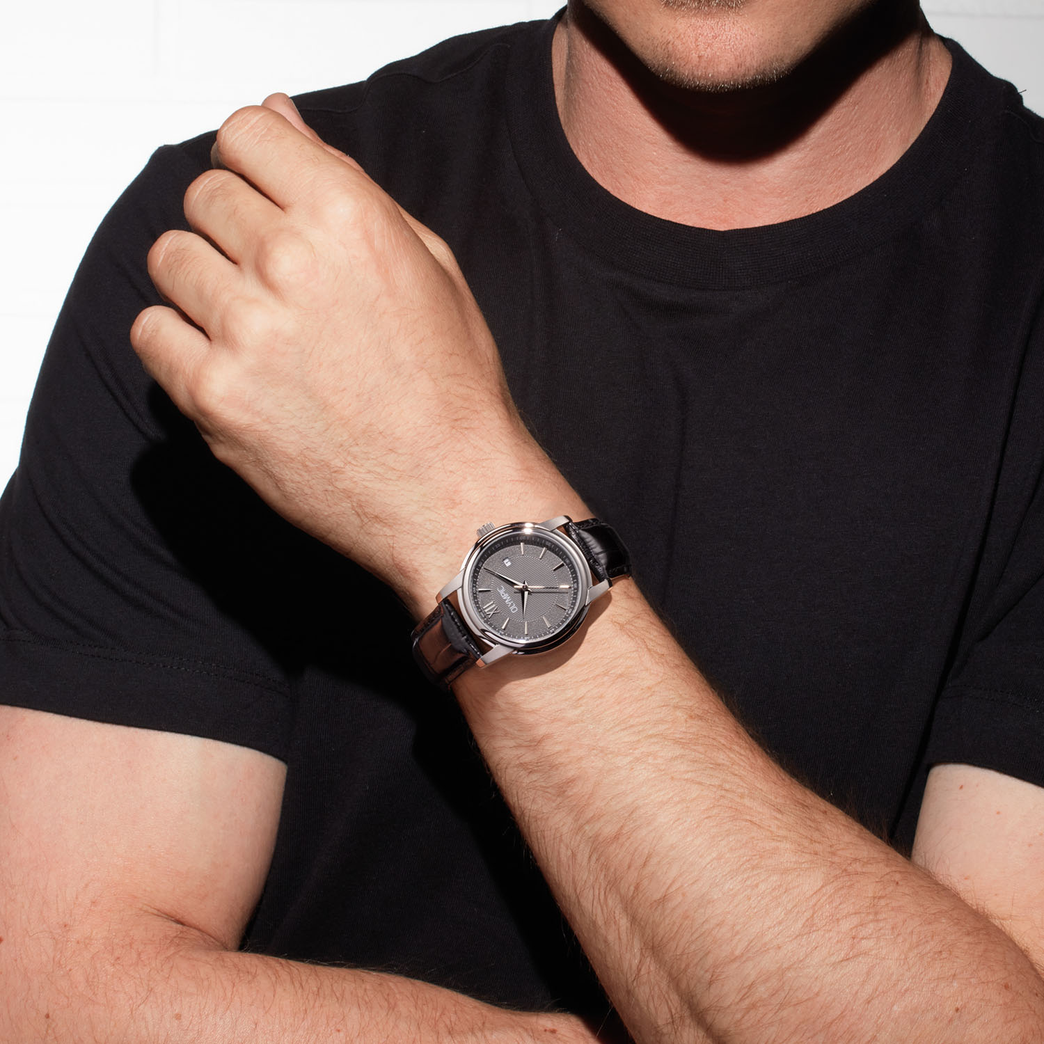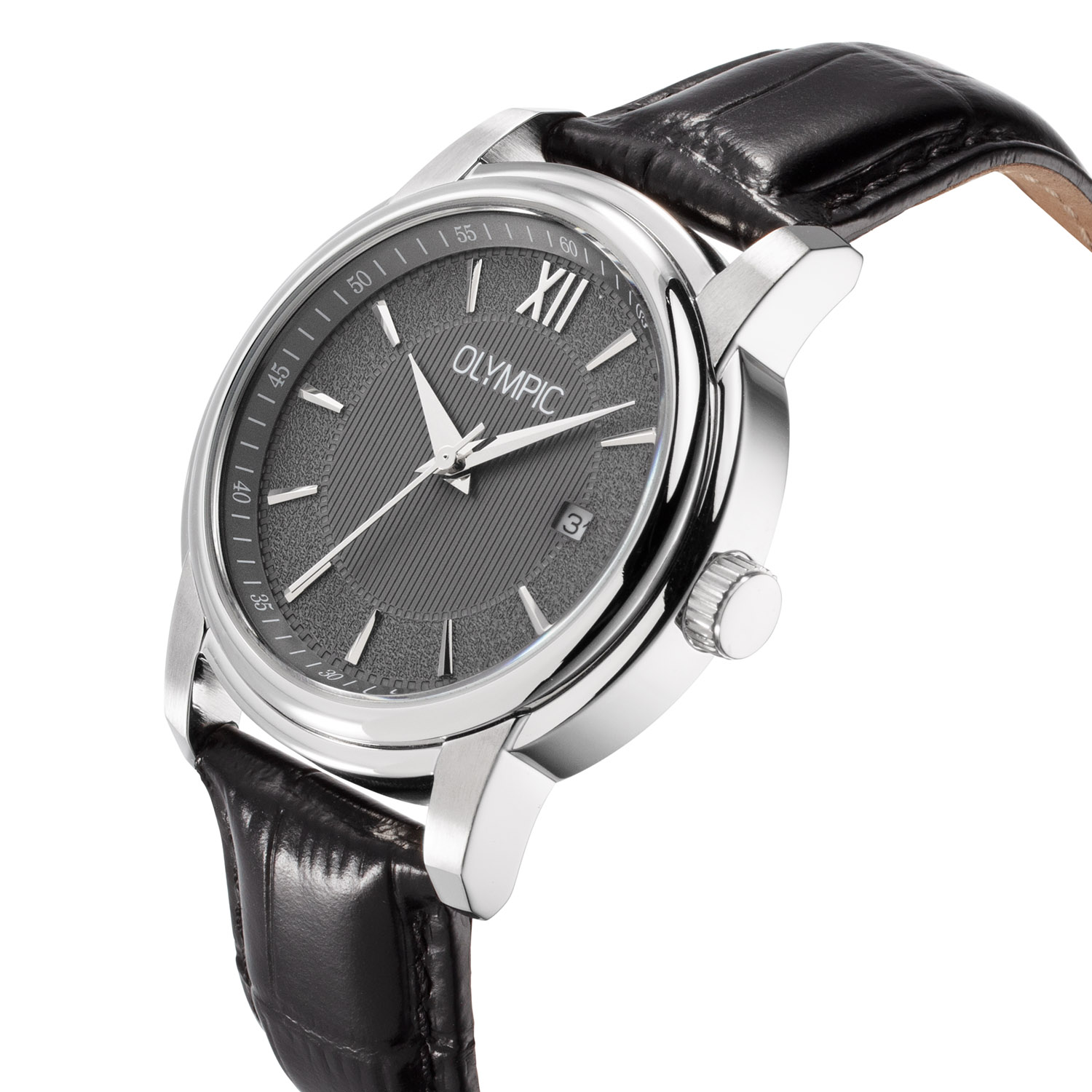 Dit unieke Olympic horloge met artikelnummer: OL89HSL059 is een classic herenhorloge. Het horloge heeft een ronde stalen kast met een grijze bewerkte wijzerplaat met streepjes als uursaanduiding en een datum. Aan de kast zit een zwarte krokoprint lerenband met een gespsluiting. Het horloge heeft een mineraalglas, een doorsnee van 39mm en is 5ATM.