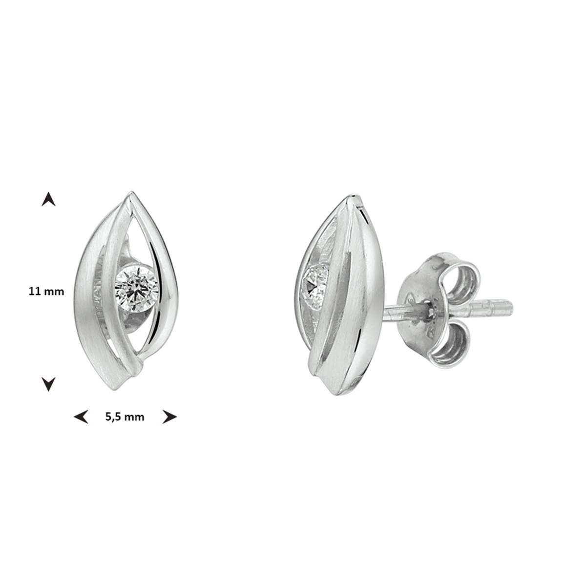 Gerhodineerd 925 zilveren oorknoppen uitgevoerd met een heldere zirkonia en een poli/matte afwerking. De oorknoppen hebben een afmeting van 11x5.5mm.
