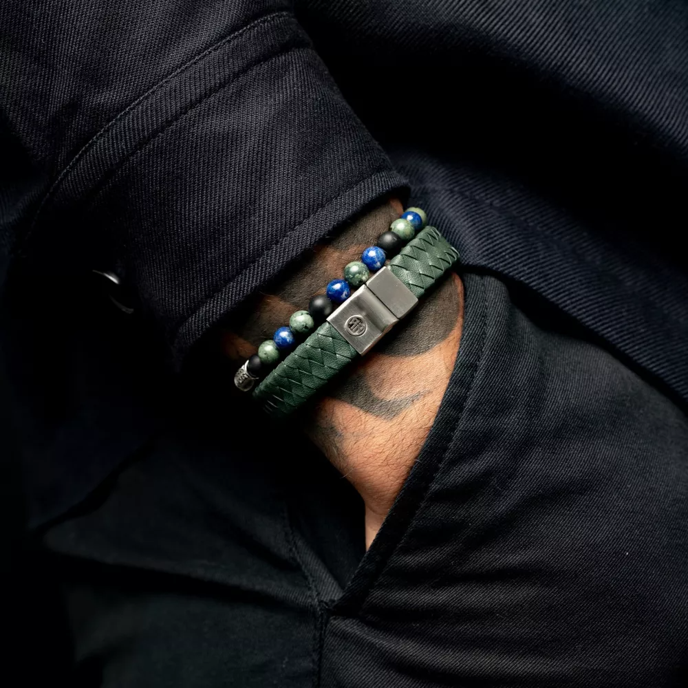 Bead armband, handgemaakt van 6mm Lapis Lazuli, Ryoliet en Onyx stenen met een zilverkleurig slot. Het Rebel & Rose sieraad is makkelijk te combineren met andere zilveren, leren of kralenarmbanden.