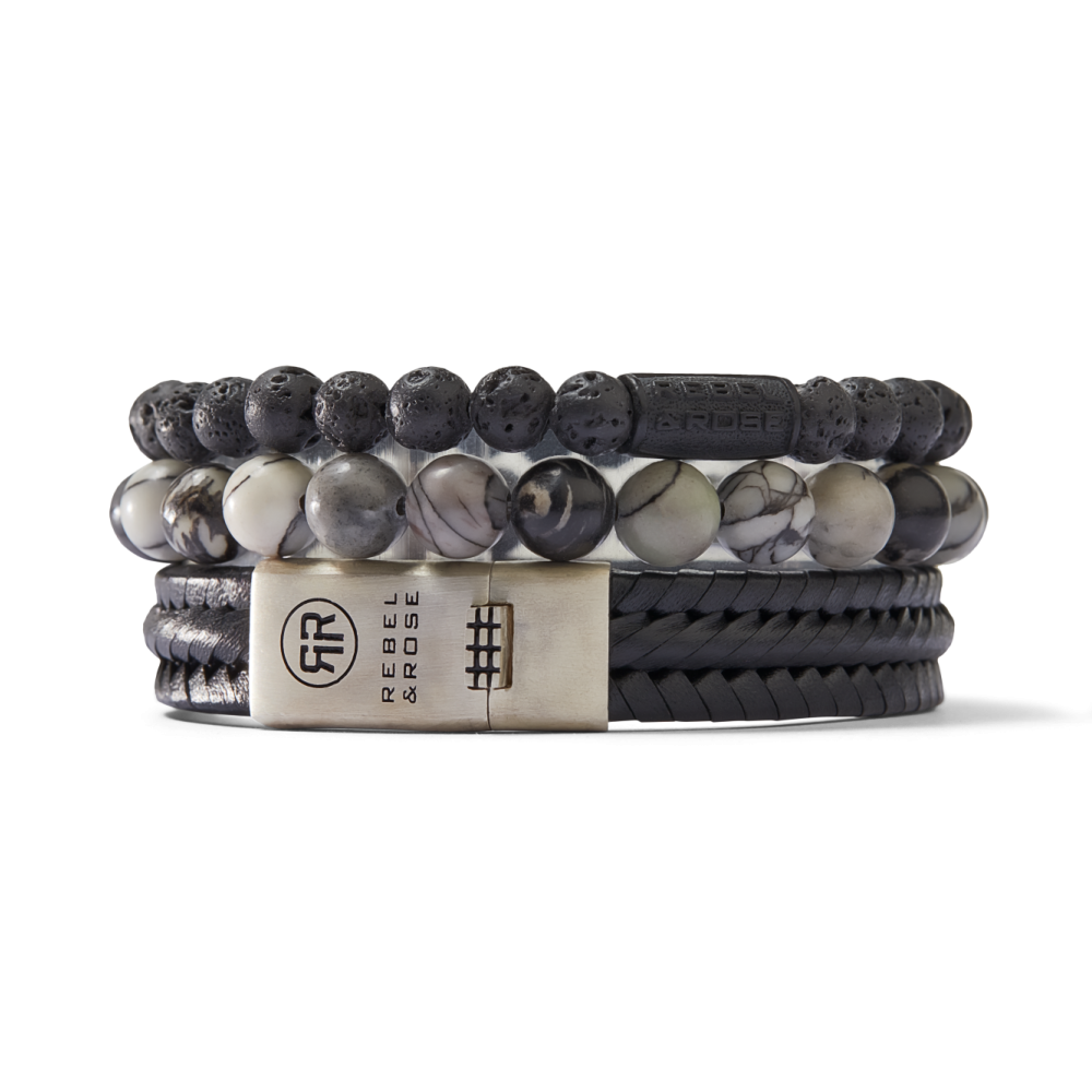 Leren gevlochten armband van het merk Rebel & Rose met zilveren sluiting. Kleur Grijs / Antraciet.