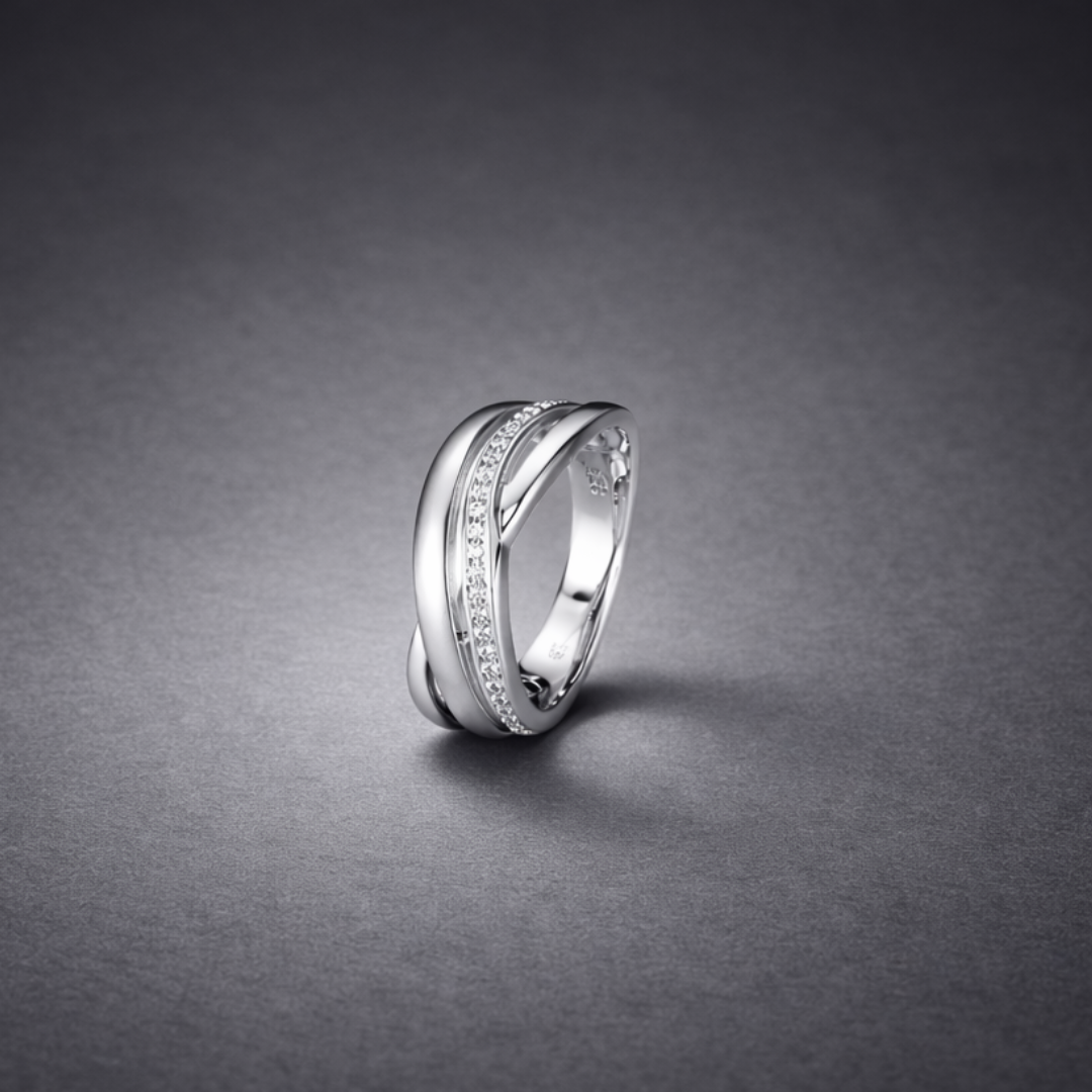 Yo Design ring Franio T1203 is een moderne zilveren ring met een vloeiende, gekruiste vorm. De zachte lijnen geven het ontwerp beweging en karakter, terwijl de subtiel geplaatste zirkonia zorgen voor een verfijnde schittering.