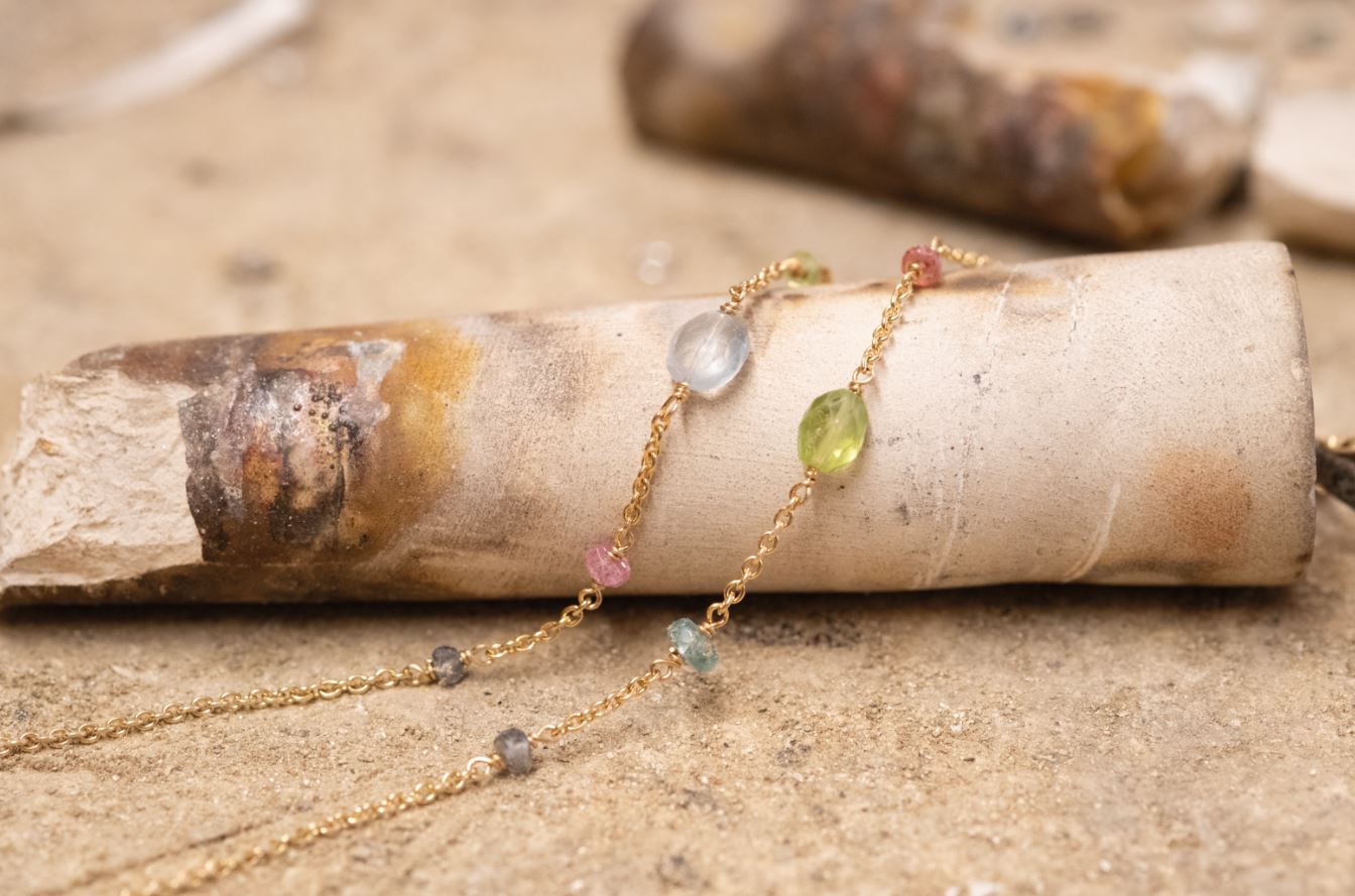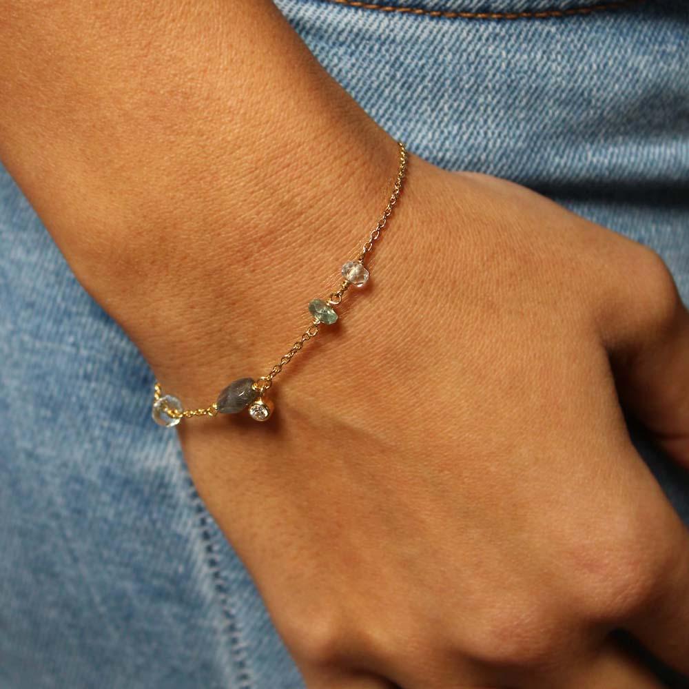 Verfijnde vergulde zilveren armband, subtiel afgewerkt met labradoriet, fluoriet en aquamarijn. De edelstenen zorgen voor een speels en elegant effect, waarbij de natuurlijke insluitsels en kleurvariaties elke armband uniek maken.
