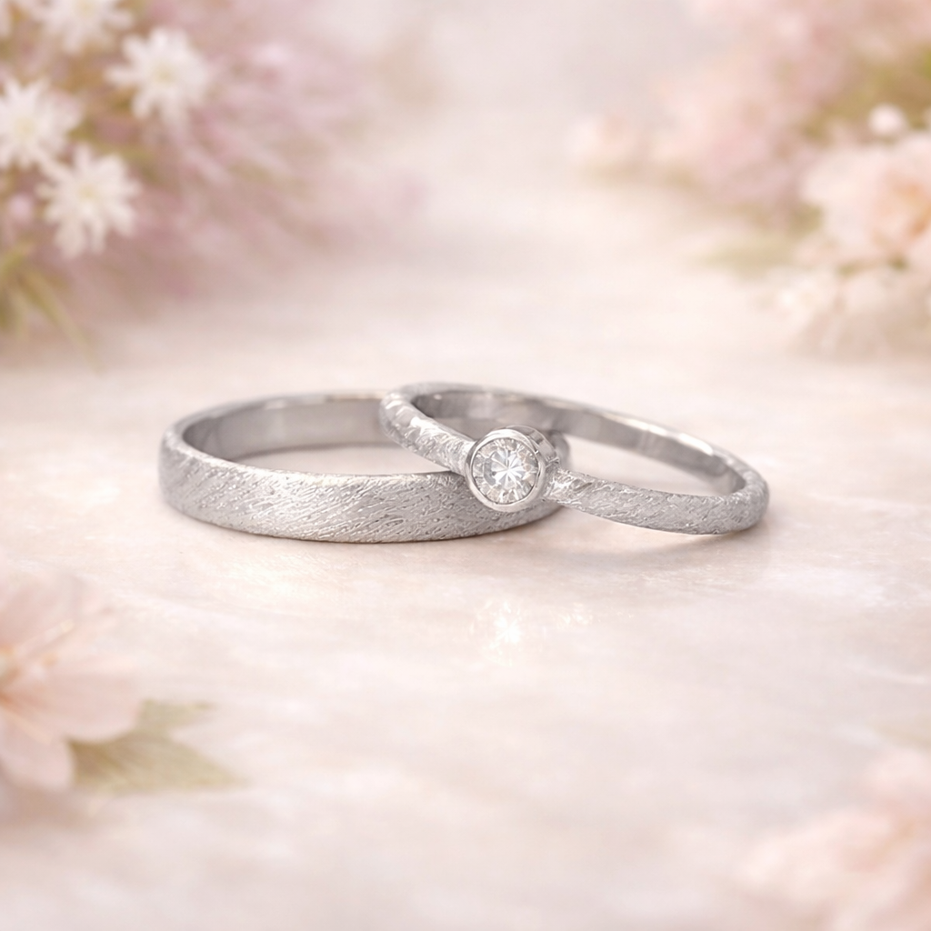 De ringen op deze foto zijn uitgevoerd in witgoud met een gesmede structuur. In één van de ringen zijn subtiel diamanten gezet, waardoor een zacht lijnenspel ontstaat tussen het matte en het sprankelende oppervlak. In ons atelier in Doesburg begeleiden we jullie graag bij het ontwerpen van jullie trouwringen, waarbij we samen kijken naar vorm, materiaal en afwerking.
