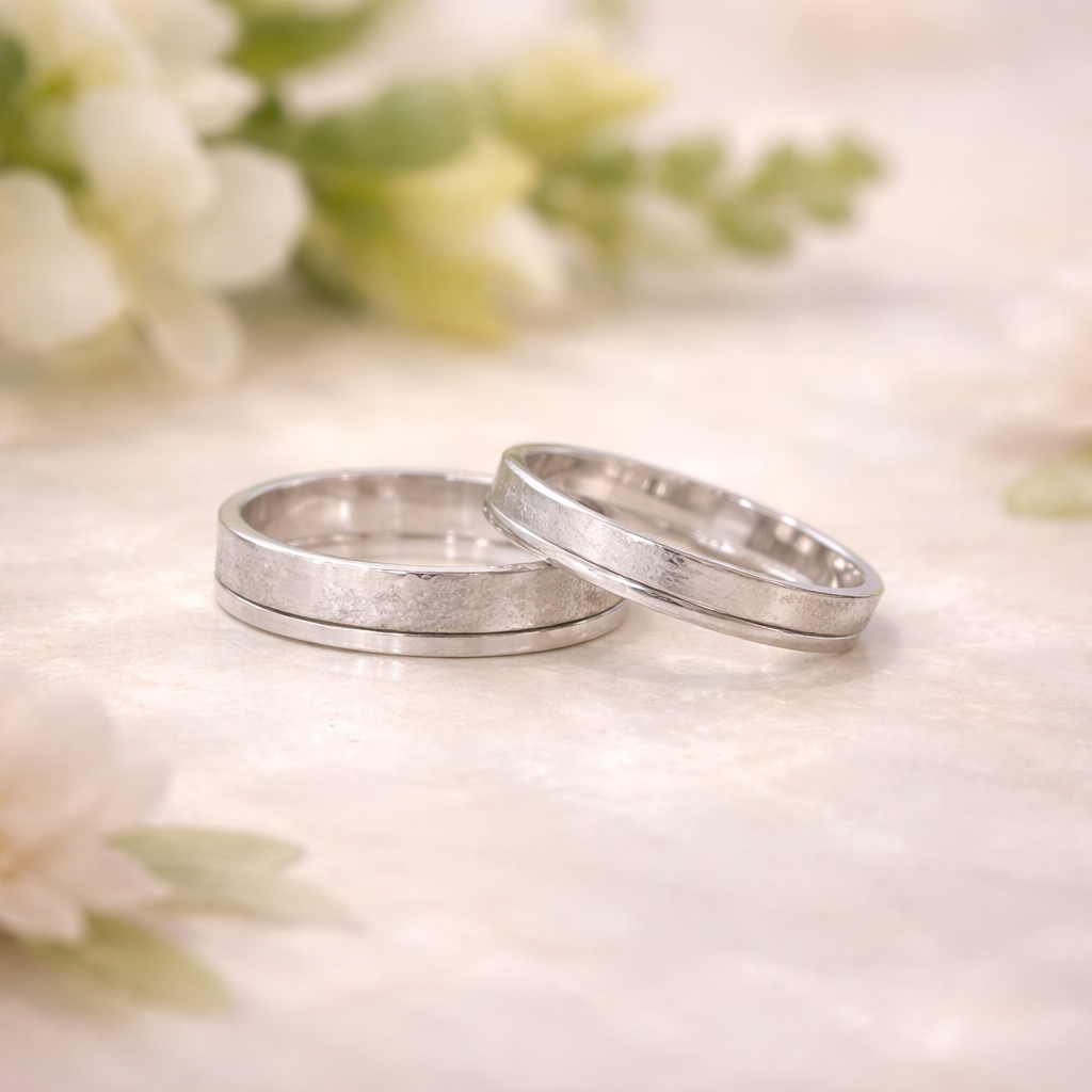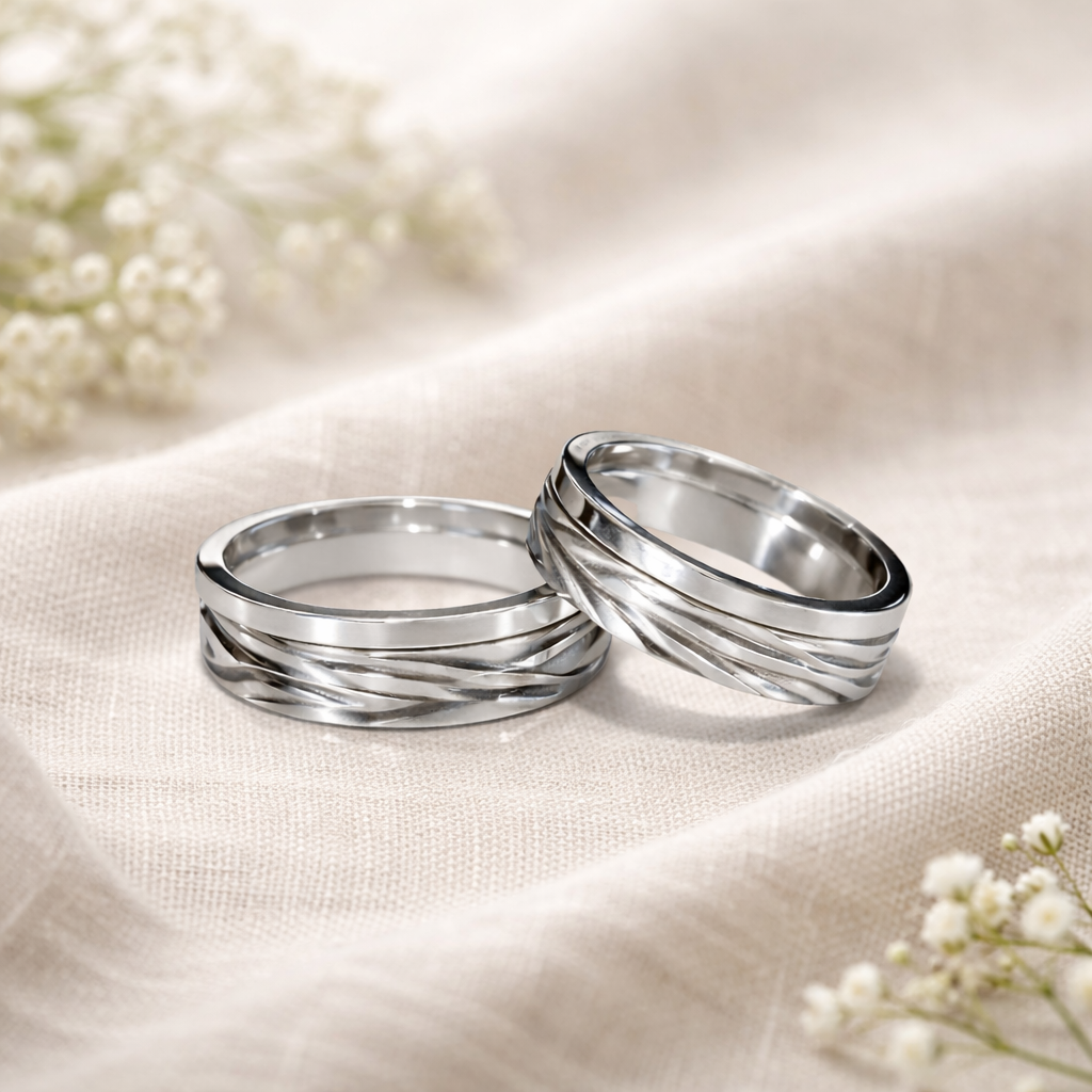Deze trouwringen kunnen volledig in witgoud of geelgoud worden gemaakt, of juist in een combinatie met zilver of titanium. Samen ontwerpen we een paar dat écht bij jullie past.