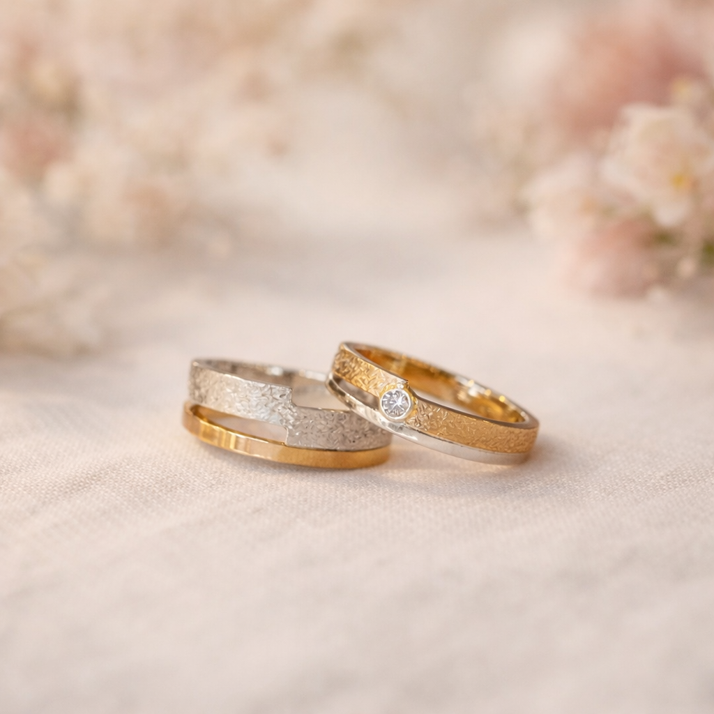 Deze ringen laten goud en witgoud prachtig samenkomen. De subtiele structuur in het geelgoud geeft elke ring een eigen karakter, terwijl de gladde witgouden rand zorgt voor een modern contrast. Zo ontstaat een tijdloos ontwerp dat symbool staat voor verbinding en balans.