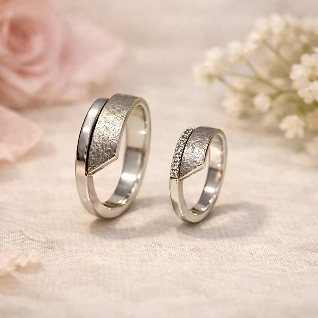 Samen vormen ze een ring met contrast én balans. Net als een huwelijk waarin twee persoonlijkheden elkaar versterken.